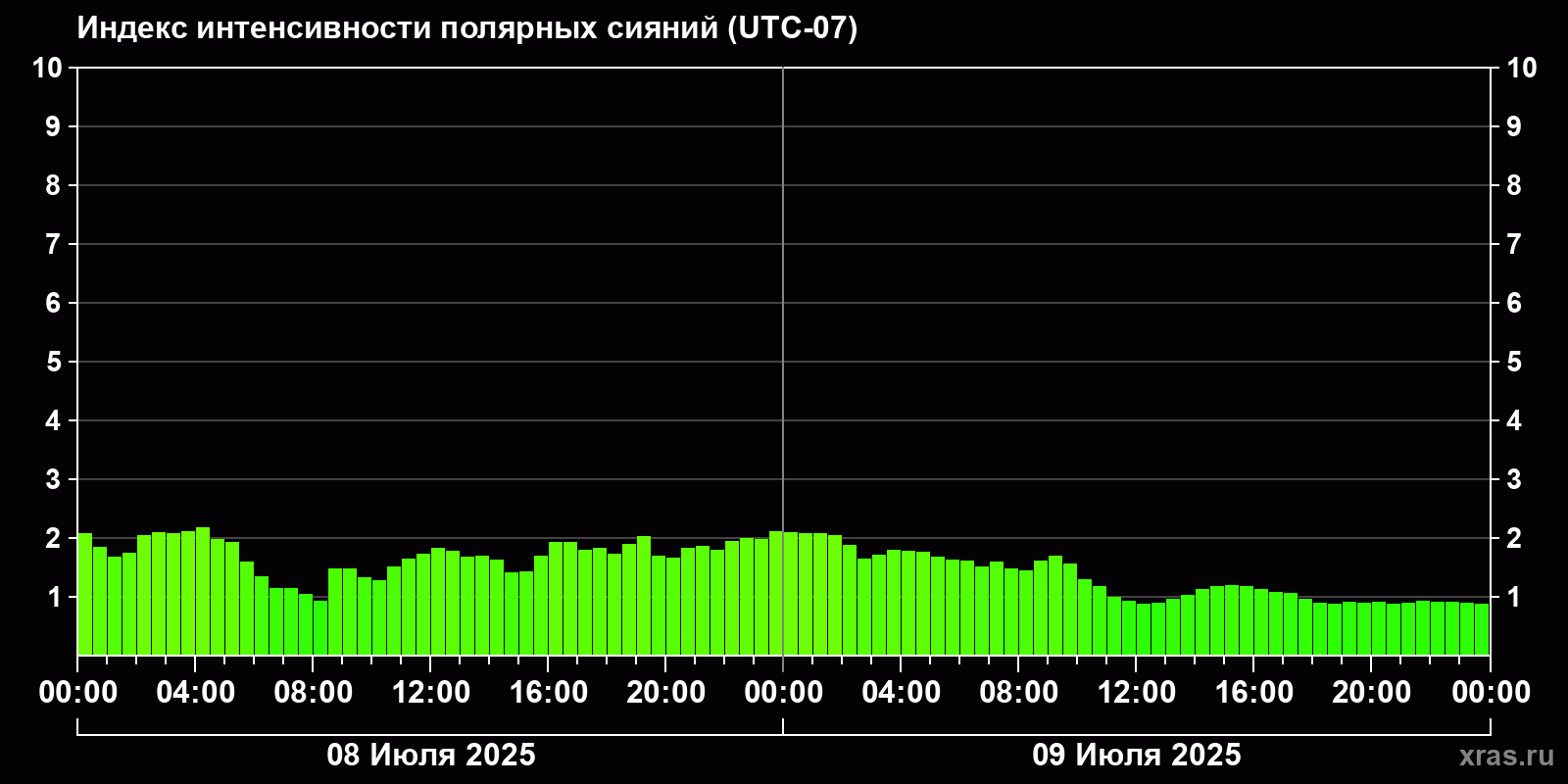 Изменения индекса интенсивности полярных сияний с 2025-07-08 по 2025-07-09 по местному времени