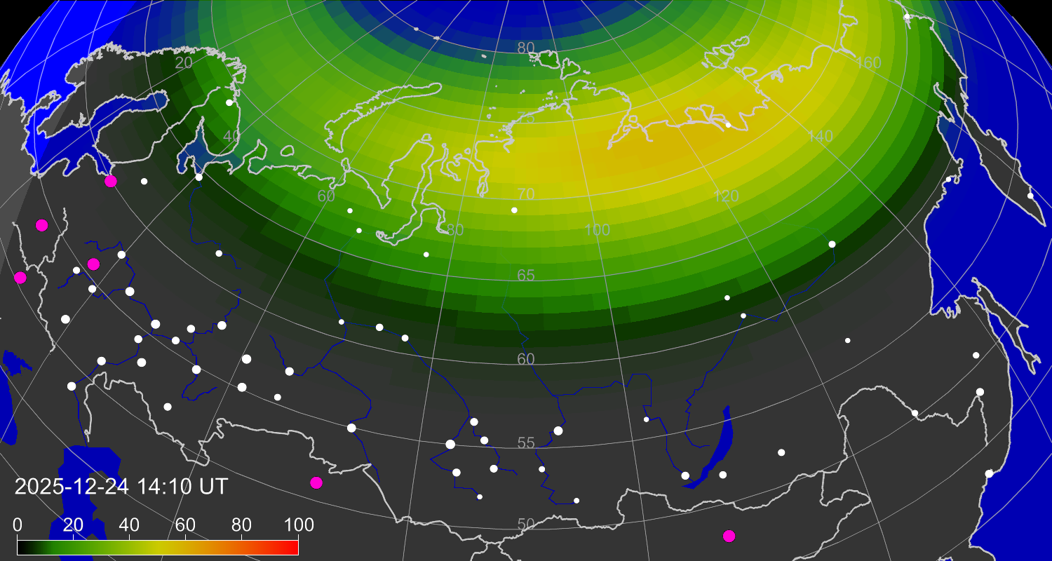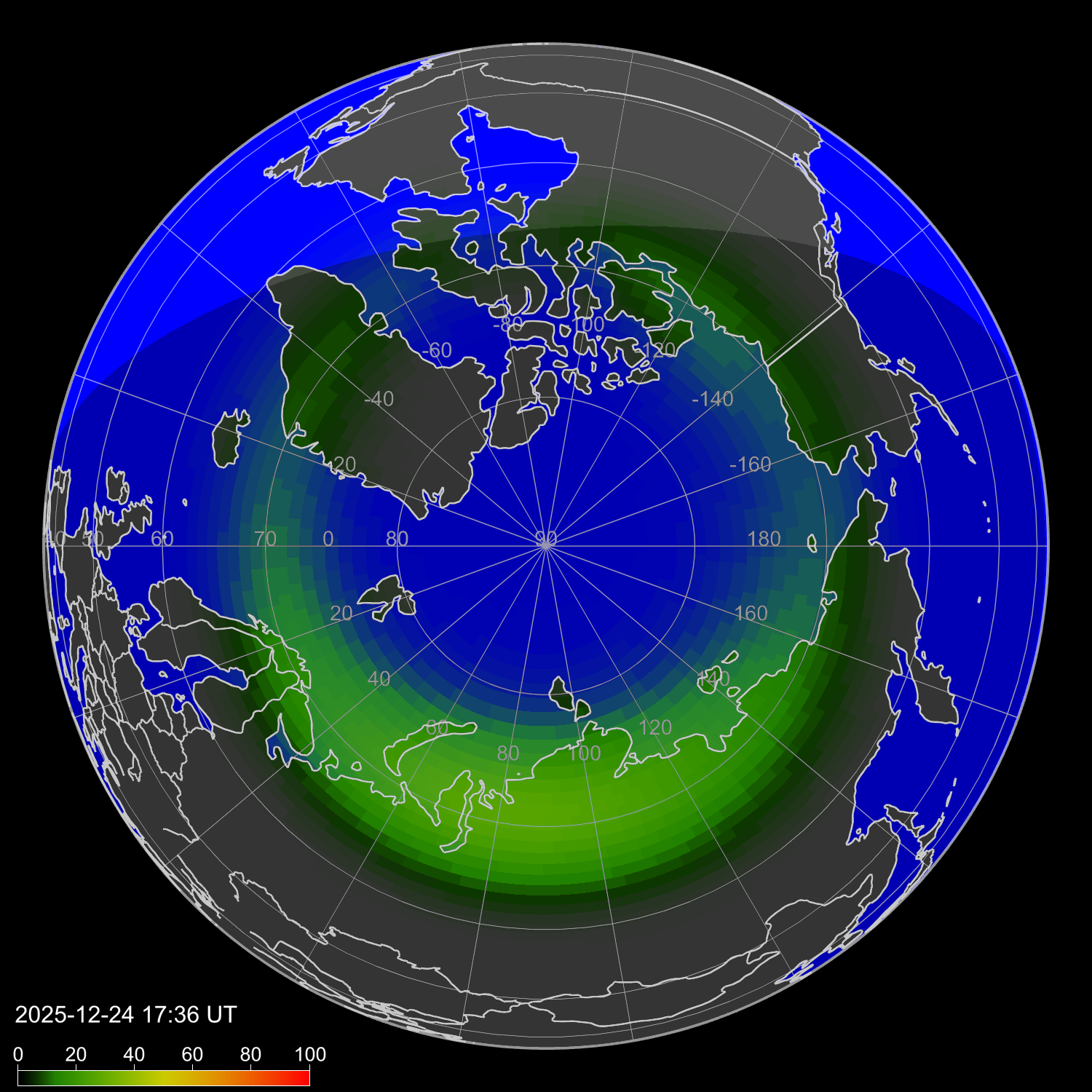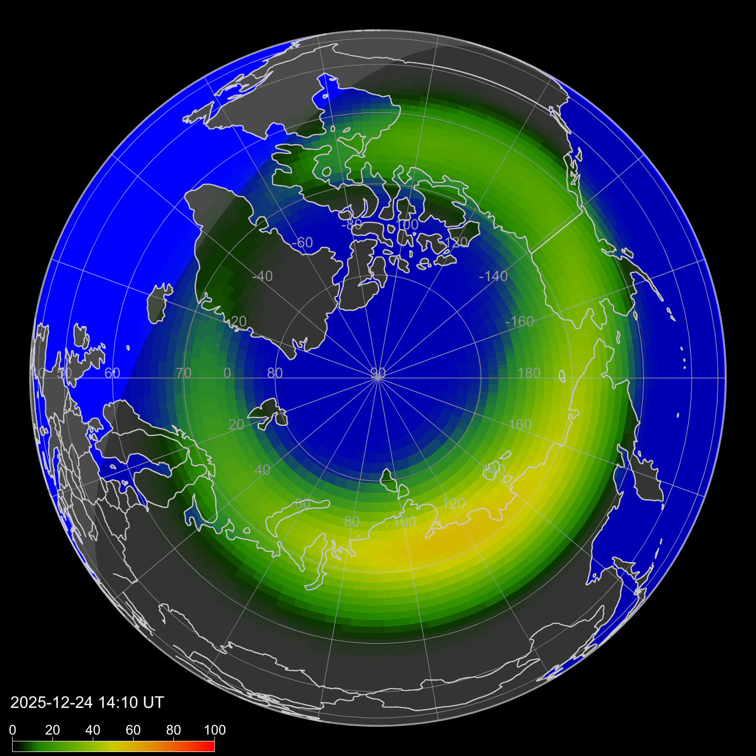 Изменения и часовой прогноз индекса интенсивности полярных сияний с 2025-12-23 по 2025-12-24