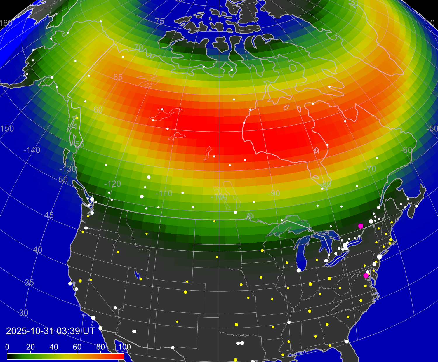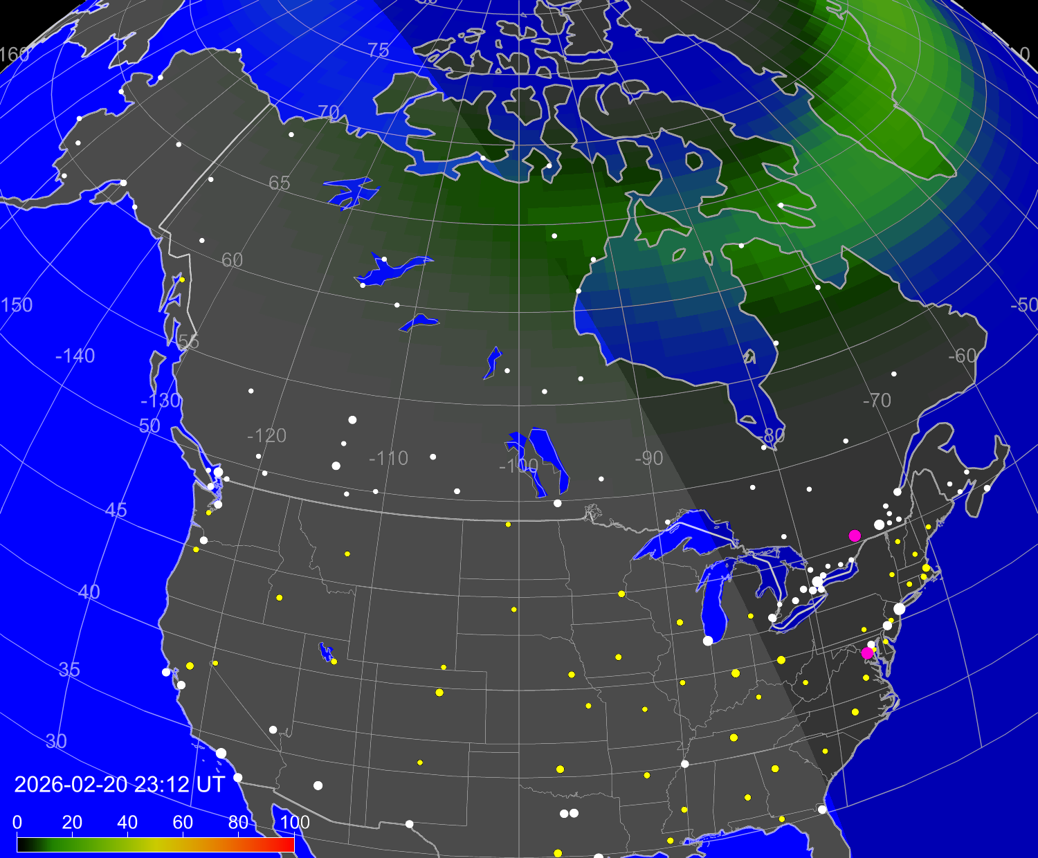 Вероятность полярных сияний в городах Канады