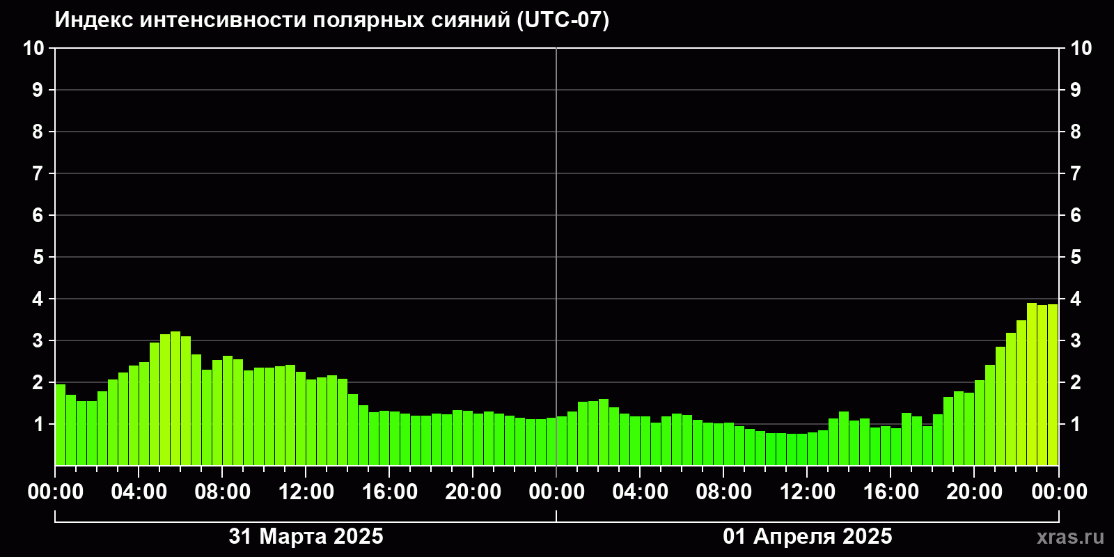 Изменения индекса интенсивности полярных сияний с 2025-03-31 по 2025-04-01 по местному времени