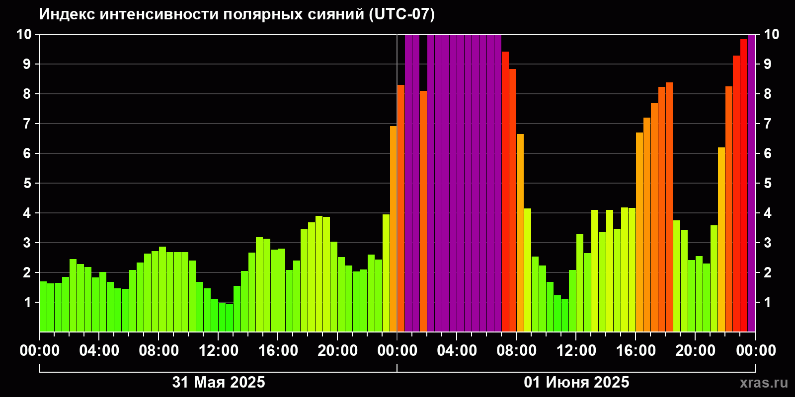 Изменения индекса интенсивности полярных сияний с 2025-05-31 по 2025-06-01 по местному времени