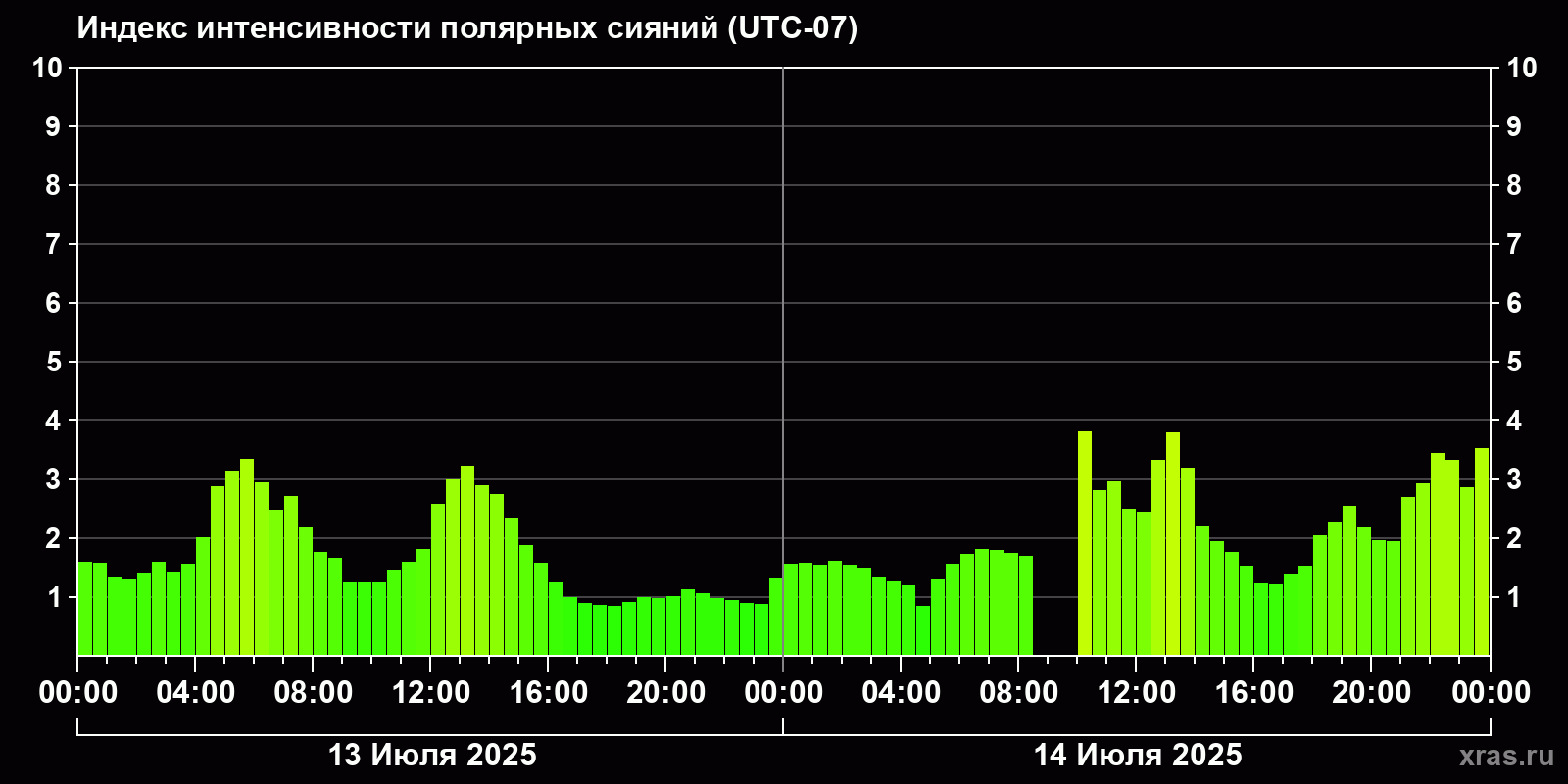 Изменения индекса интенсивности полярных сияний с 2025-07-13 по 2025-07-14 по местному времени