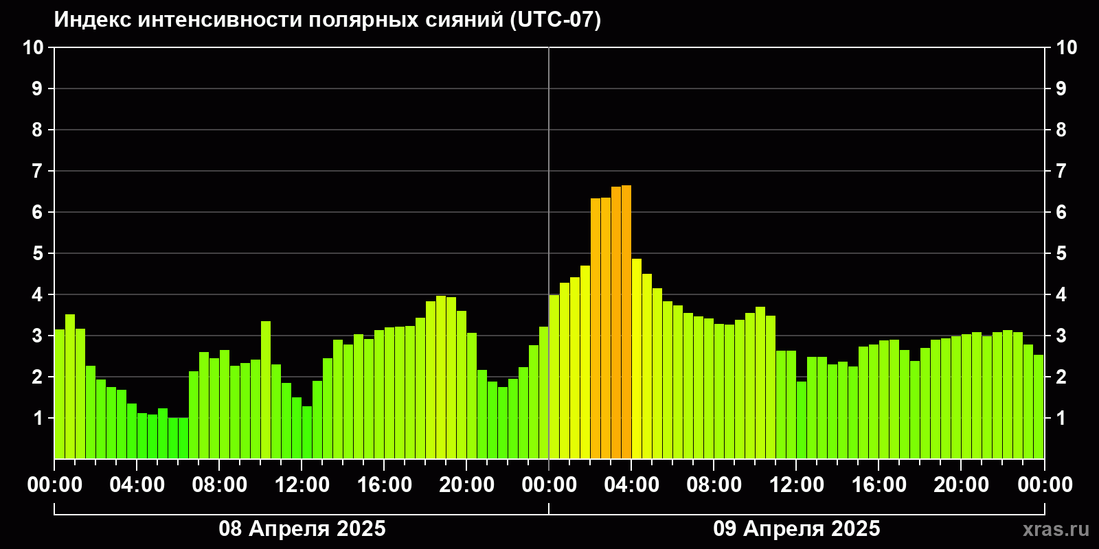 Изменения индекса интенсивности полярных сияний с 2025-04-08 по 2025-04-09 по местному времени