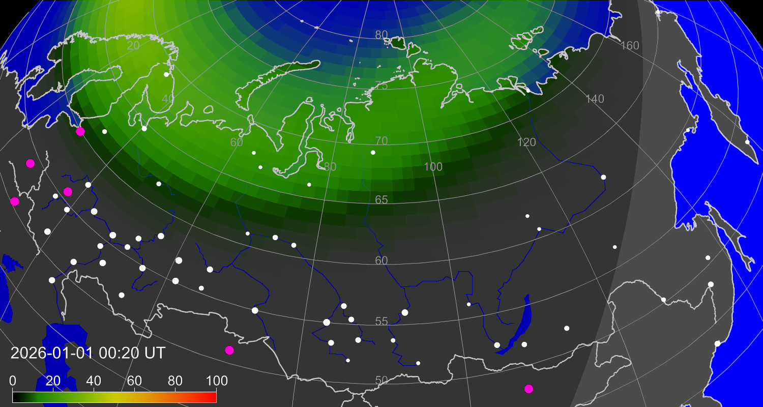 Изменения и часовой прогноз индекса интенсивности полярных сияний с 2025-12-31 по 2026-01-01