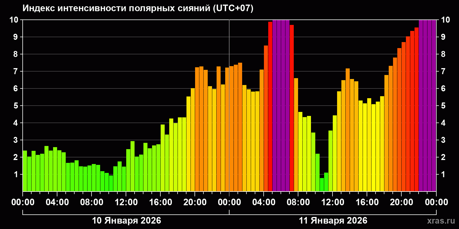 Изменения индекса интенсивности полярных сияний с 2026-01-10 по 2026-01-11 по местному времени