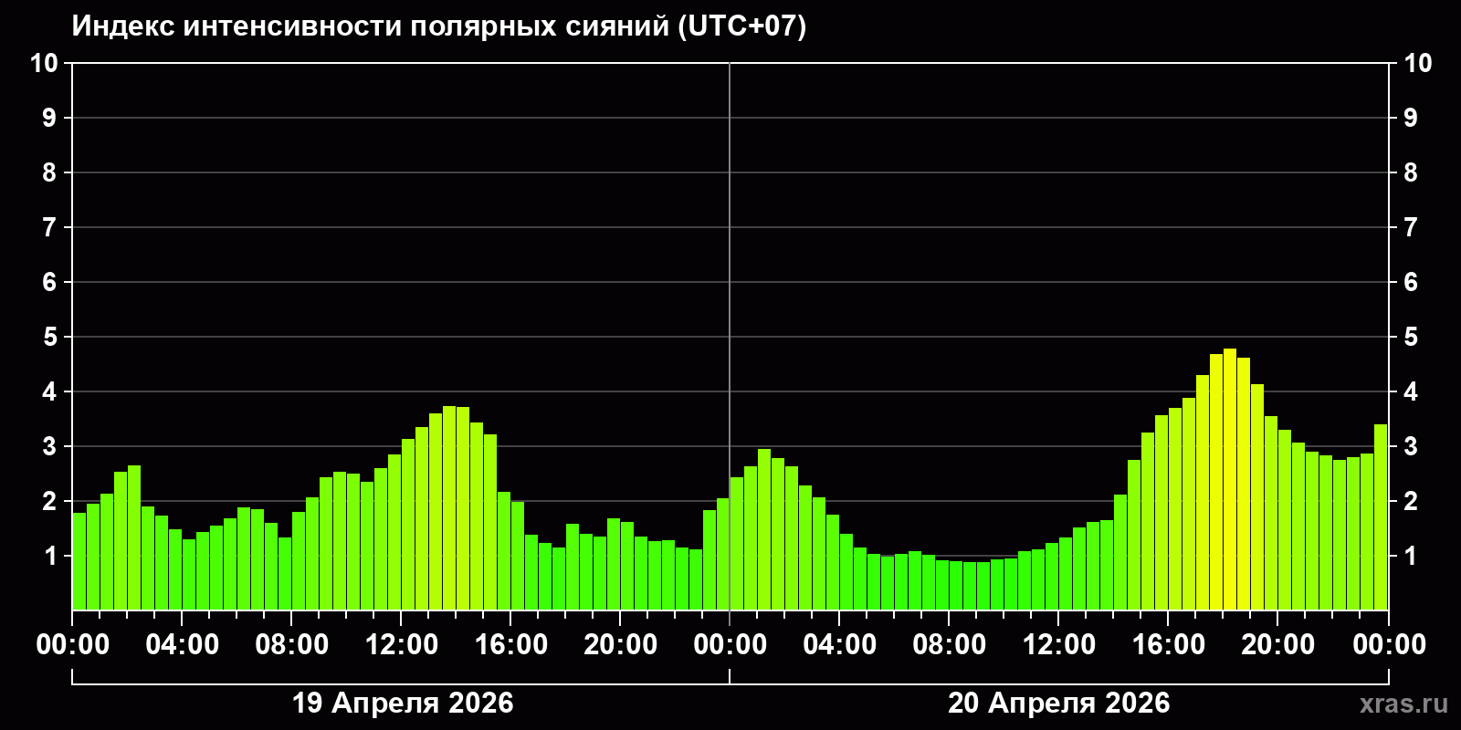 Изменения индекса интенсивности полярных сияний с 2026-04-19 по 2026-04-20 по местному времени