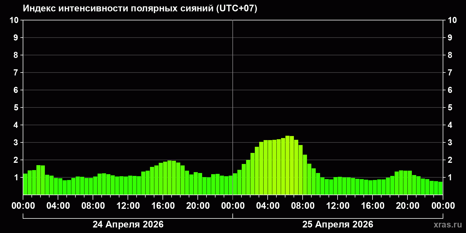 Изменения индекса интенсивности полярных сияний с 2026-04-24 по 2026-04-25 по местному времени