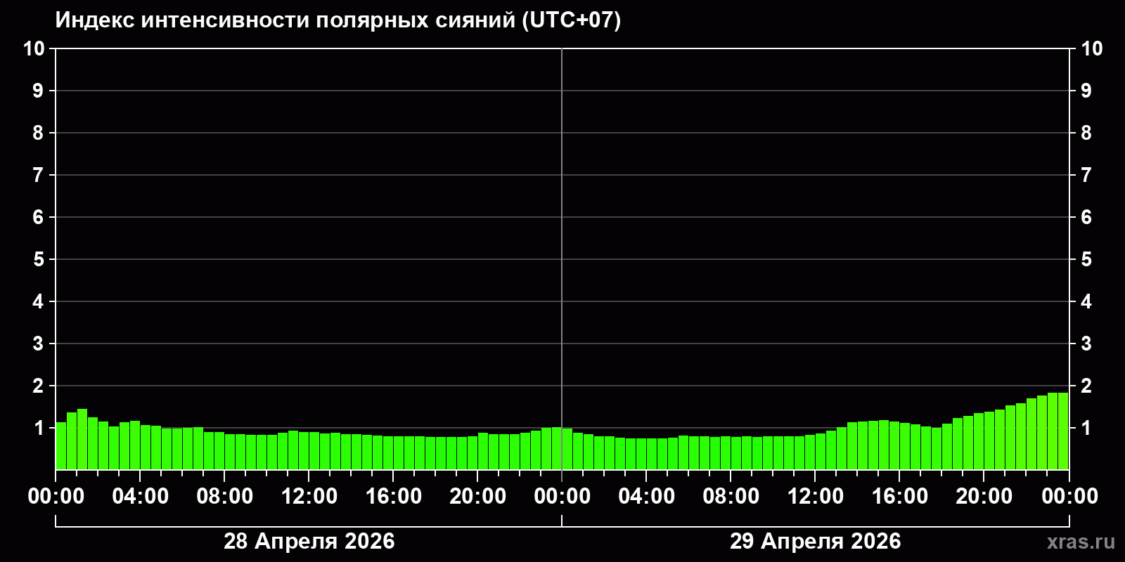Изменения индекса интенсивности полярных сияний с 2026-04-28 по 2026-04-29 по местному времени