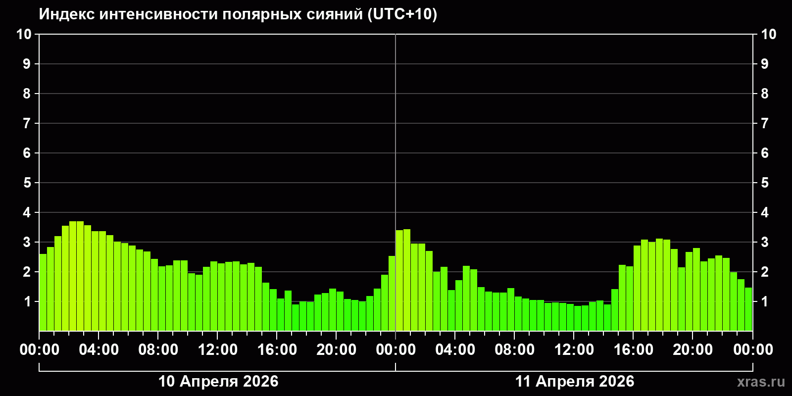 Изменения индекса интенсивности полярных сияний с 2026-04-10 по 2026-04-11 по местному времени