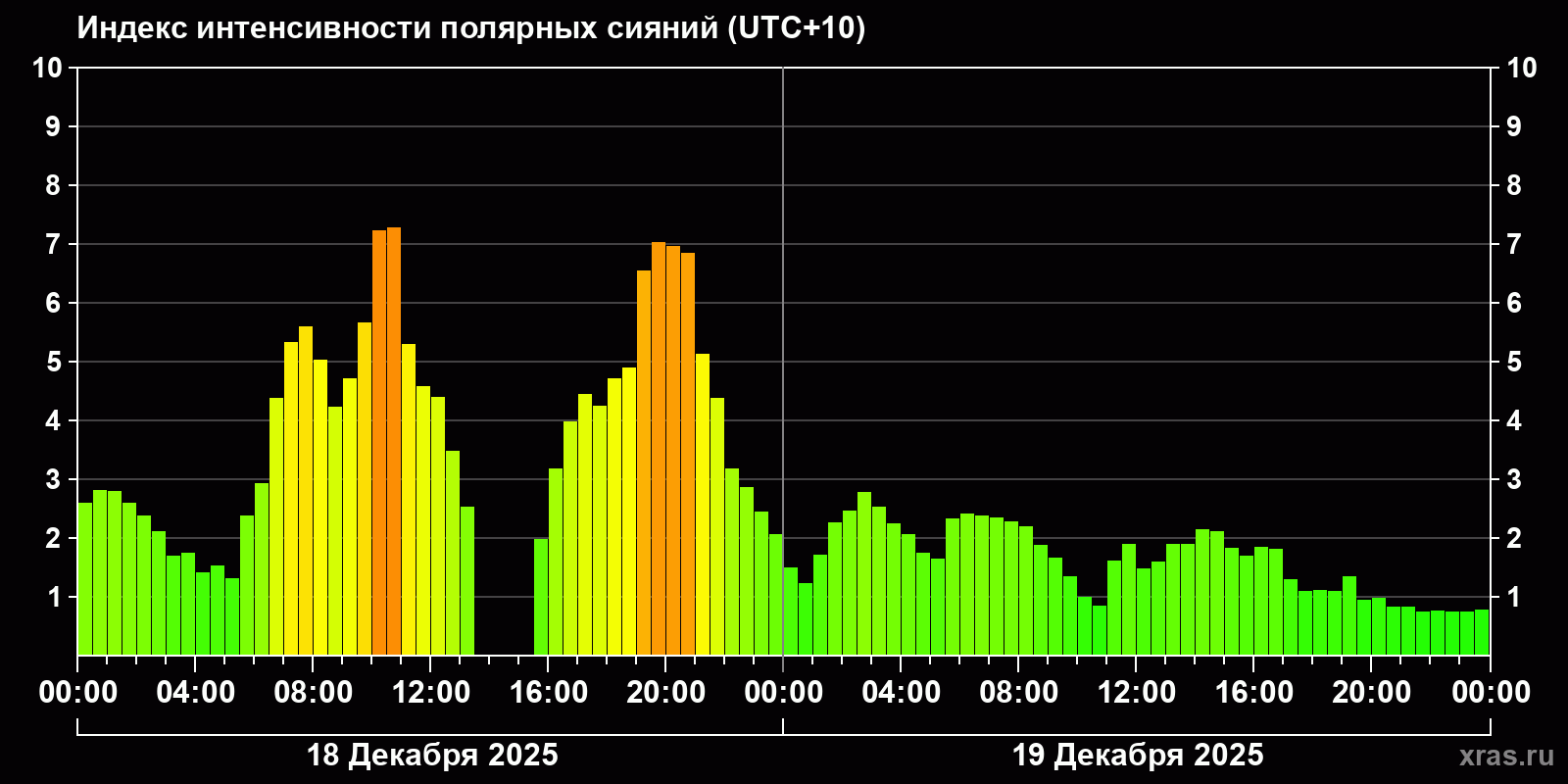 Изменения индекса интенсивности полярных сияний с 2025-12-18 по 2025-12-19 по местному времени