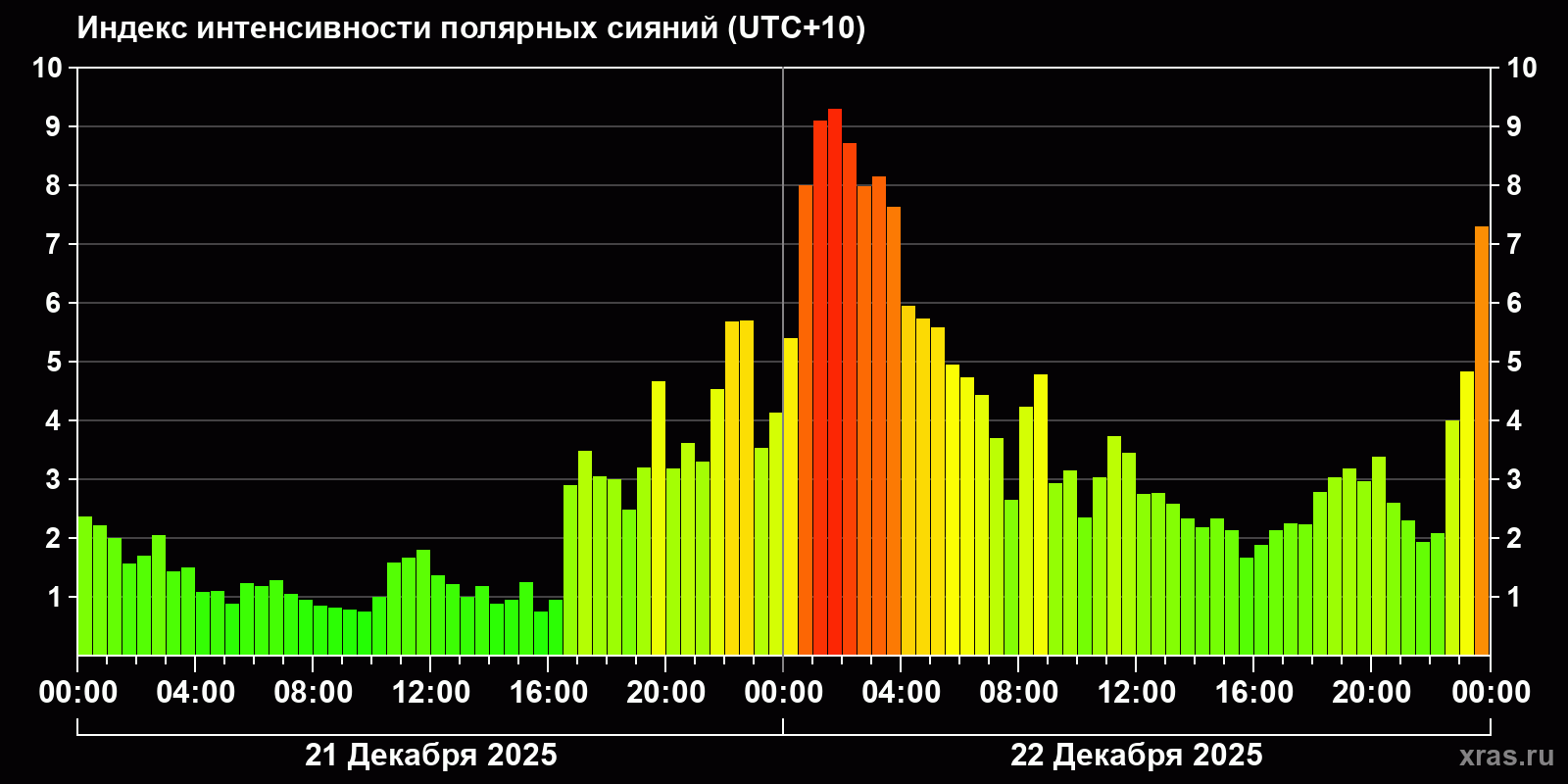Изменения индекса интенсивности полярных сияний с 2025-12-21 по 2025-12-22 по местному времени