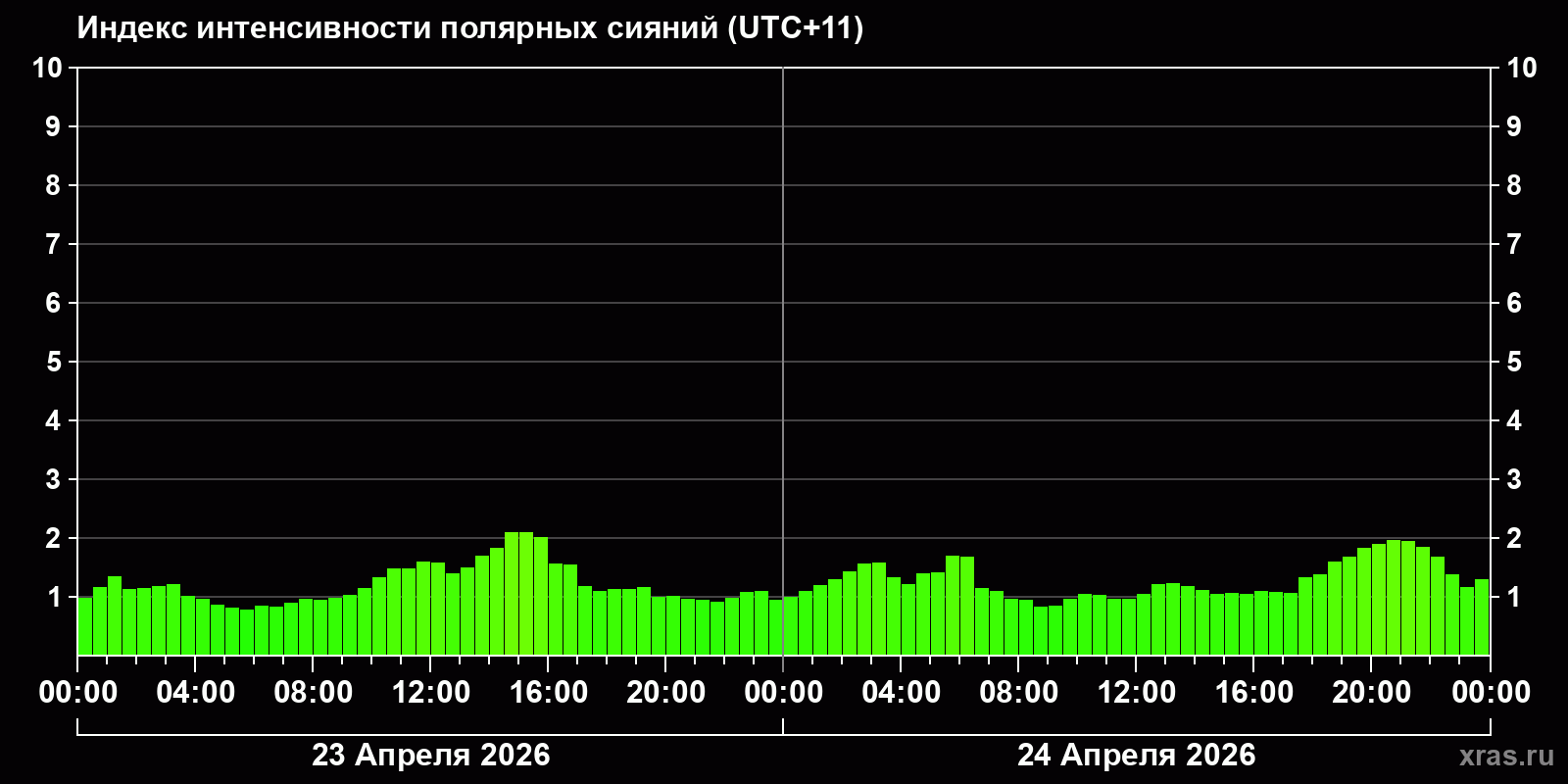 Изменения индекса интенсивности полярных сияний с 2026-04-23 по 2026-04-24 по местному времени