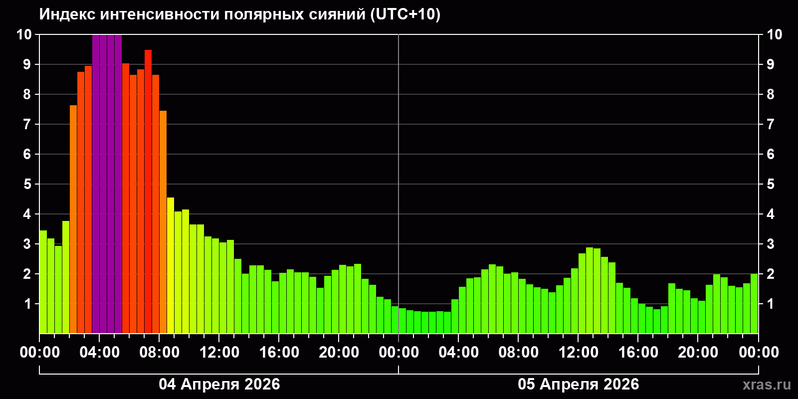 Изменения индекса интенсивности полярных сияний с 2026-04-04 по 2026-04-05 по местному времени
