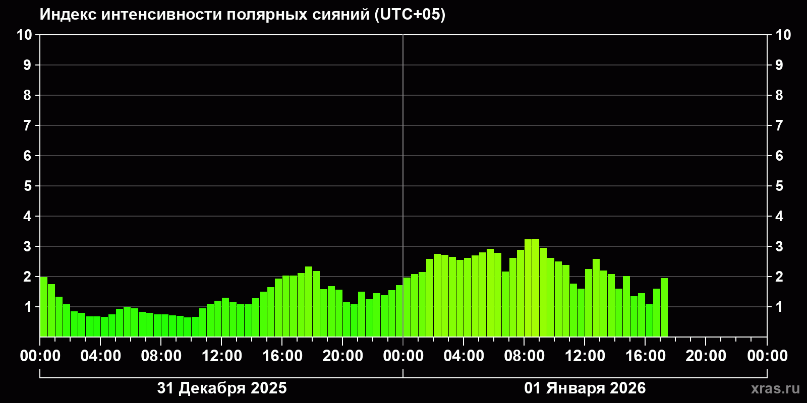Изменения индекса интенсивности полярных сияний с 2025-12-31 по 2026-01-01 по местному времени