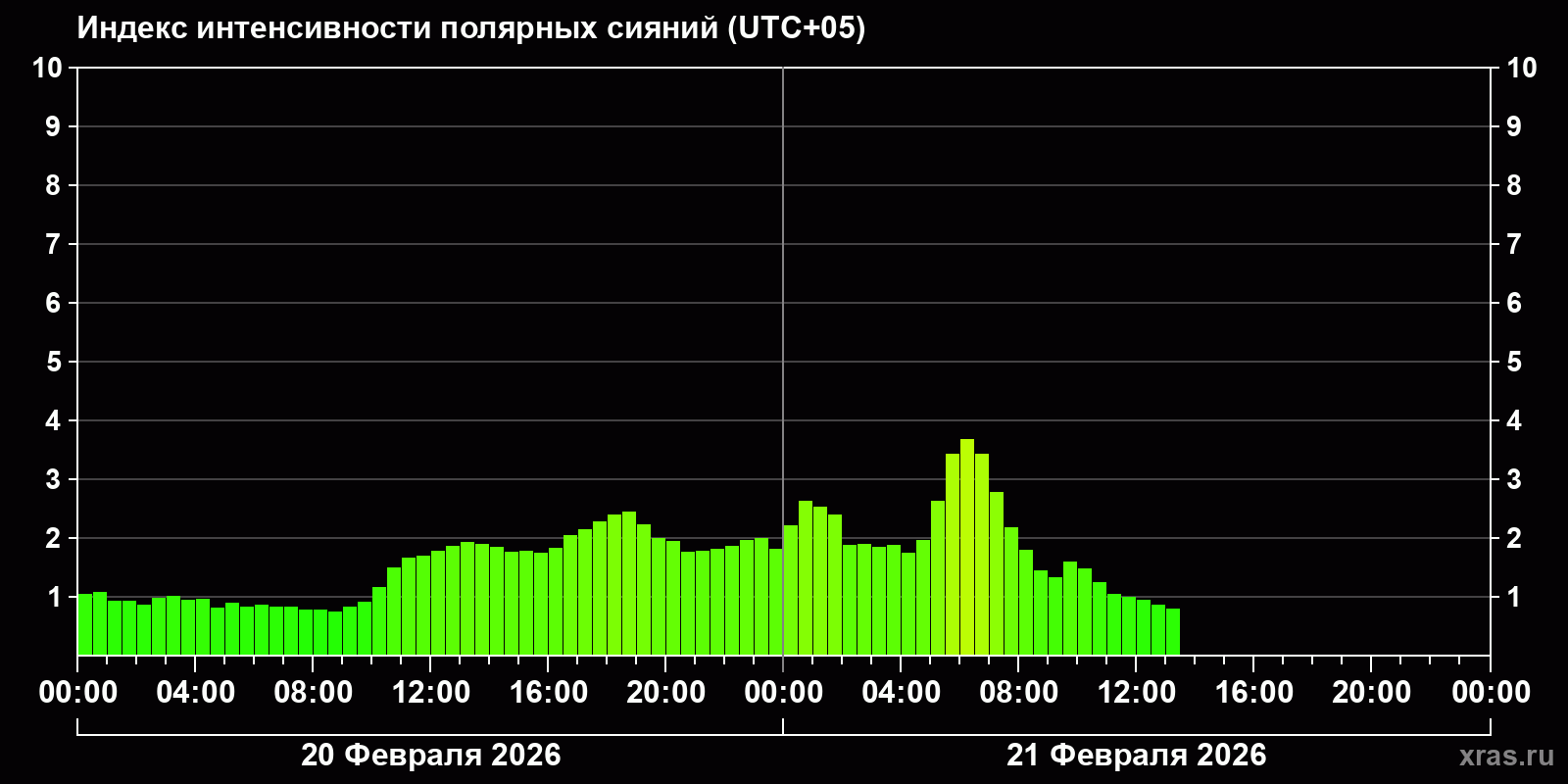 Изменения индекса интенсивности полярных сияний с 2026-02-20 по 2026-02-21 по местному времени
