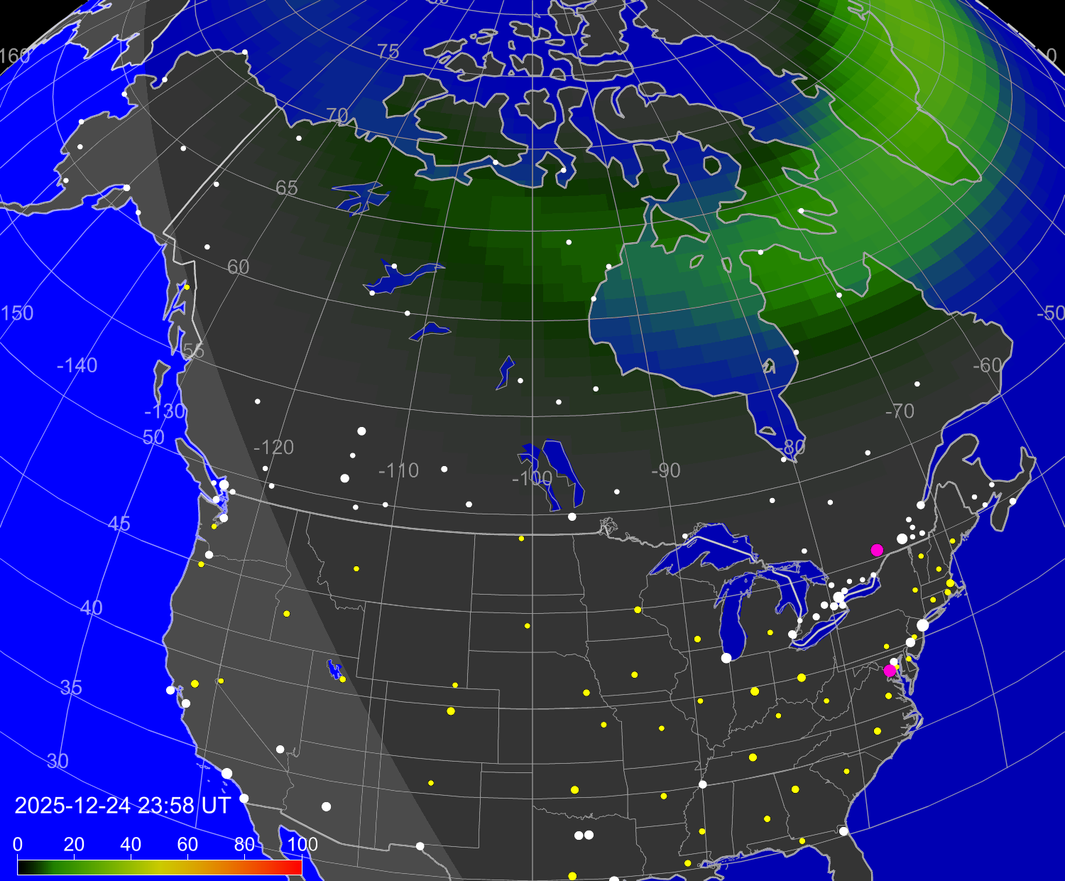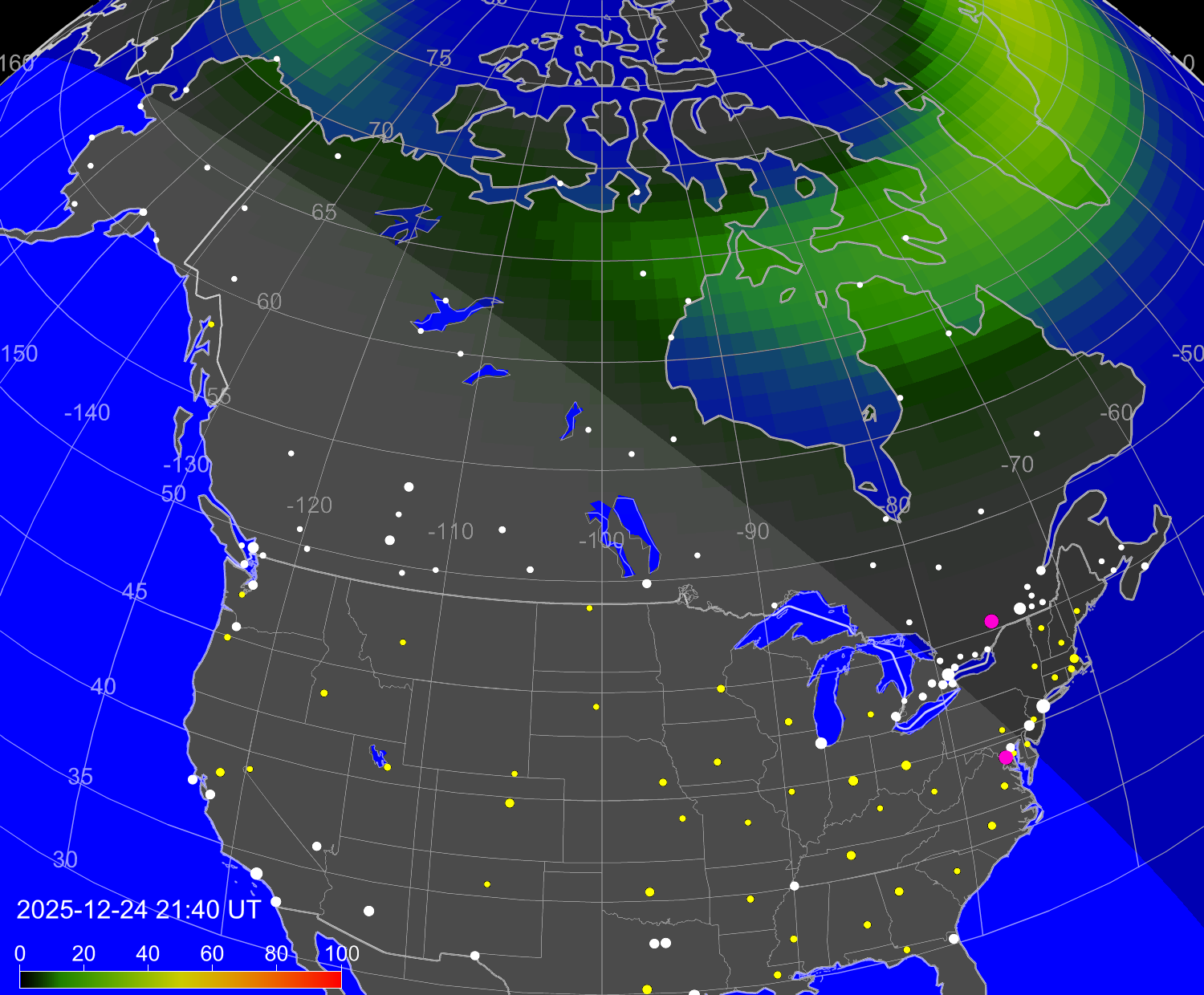 Вероятность полярных сияний в городах Канады