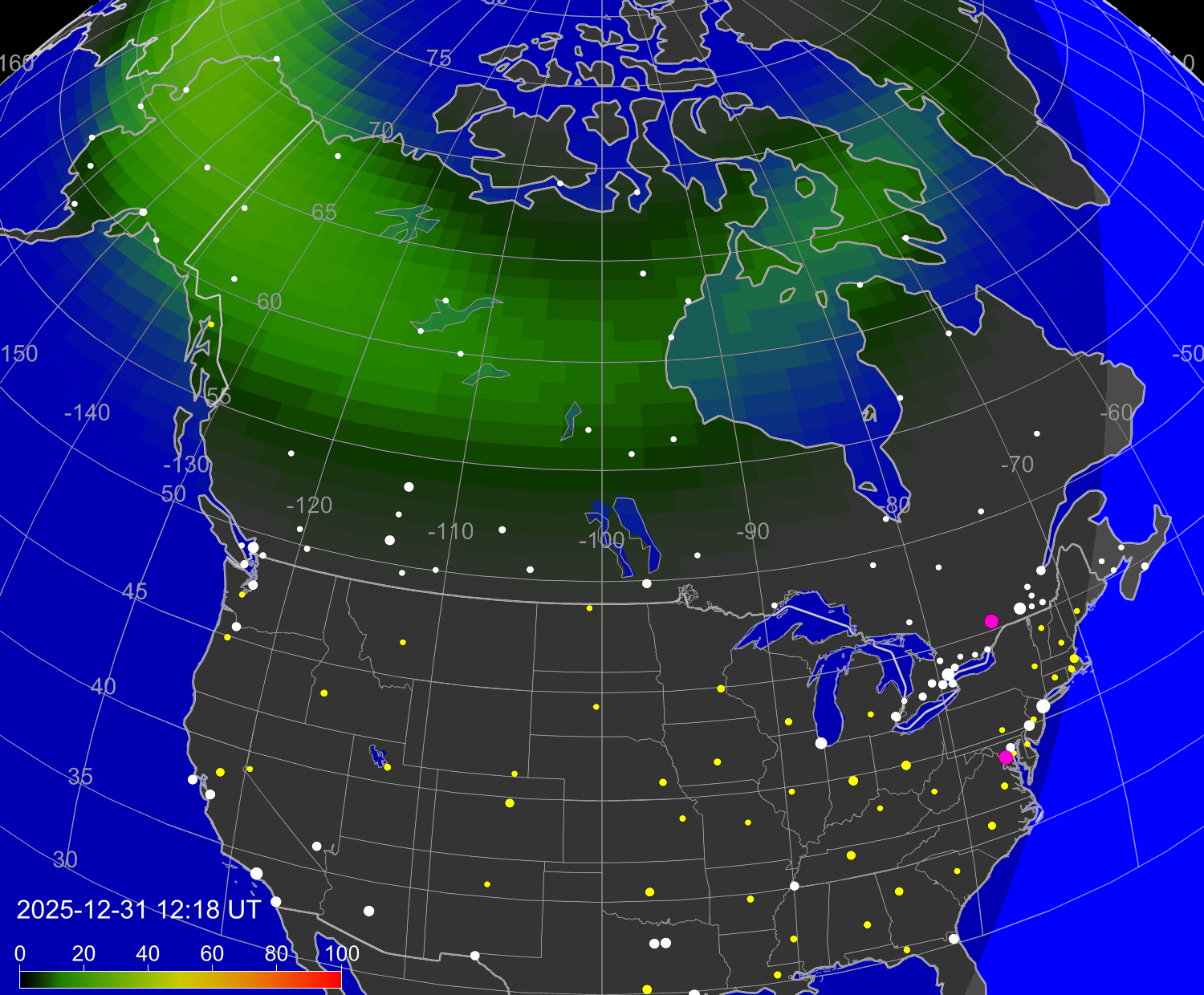 Изменения и часовой прогноз индекса интенсивности полярных сияний с 2025-12-31 по 2026-01-01