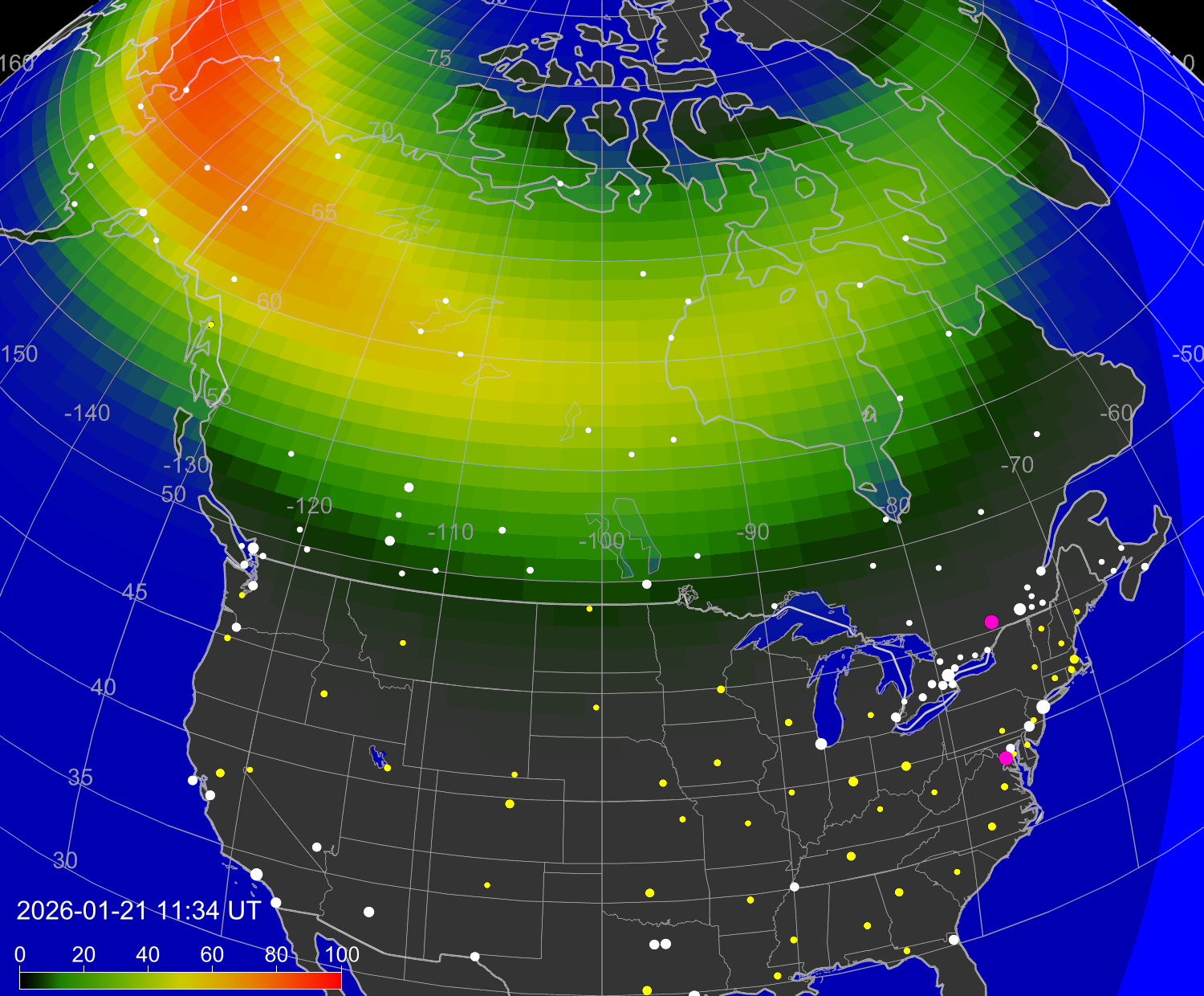 Изменения и часовой прогноз индекса интенсивности полярных сияний с 2026-01-21 по 2026-01-22