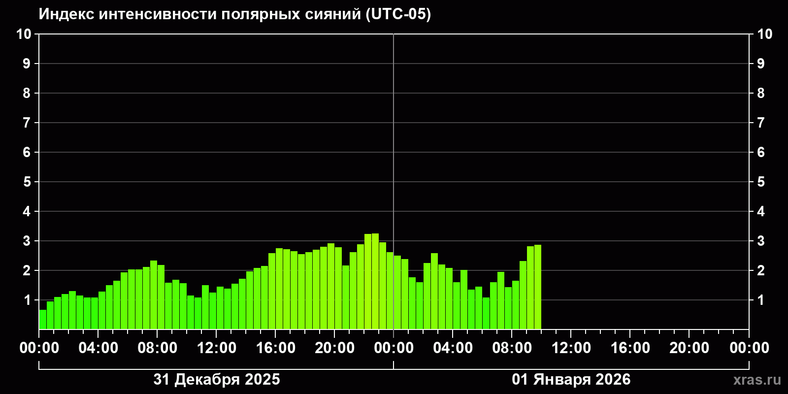 Изменения индекса интенсивности полярных сияний с 2025-12-31 по 2026-01-01 по местному времени
