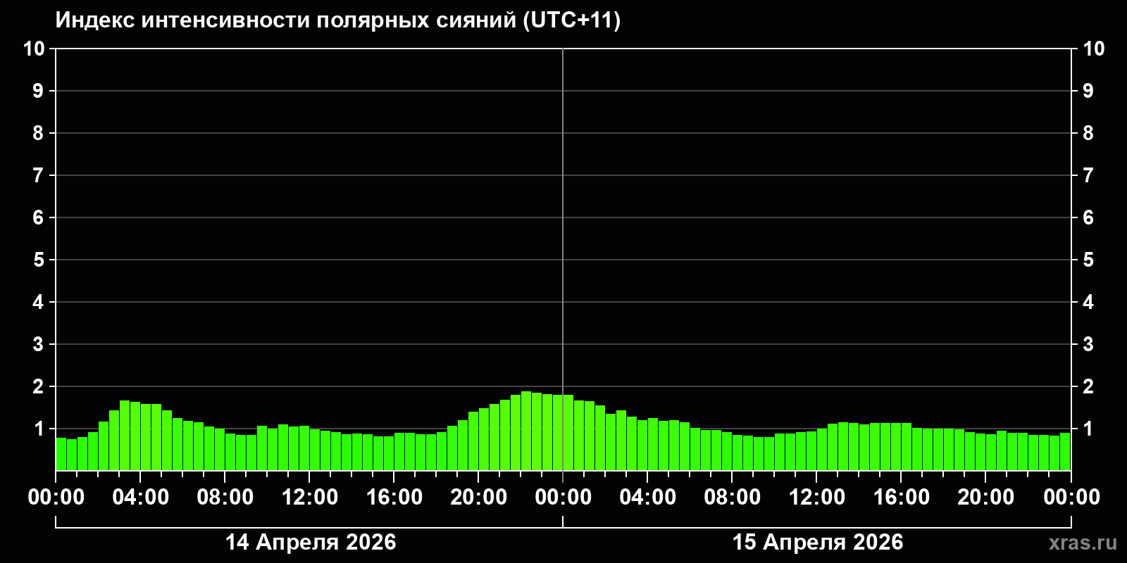 Изменения индекса интенсивности полярных сияний с 2026-04-14 по 2026-04-15 по местному времени