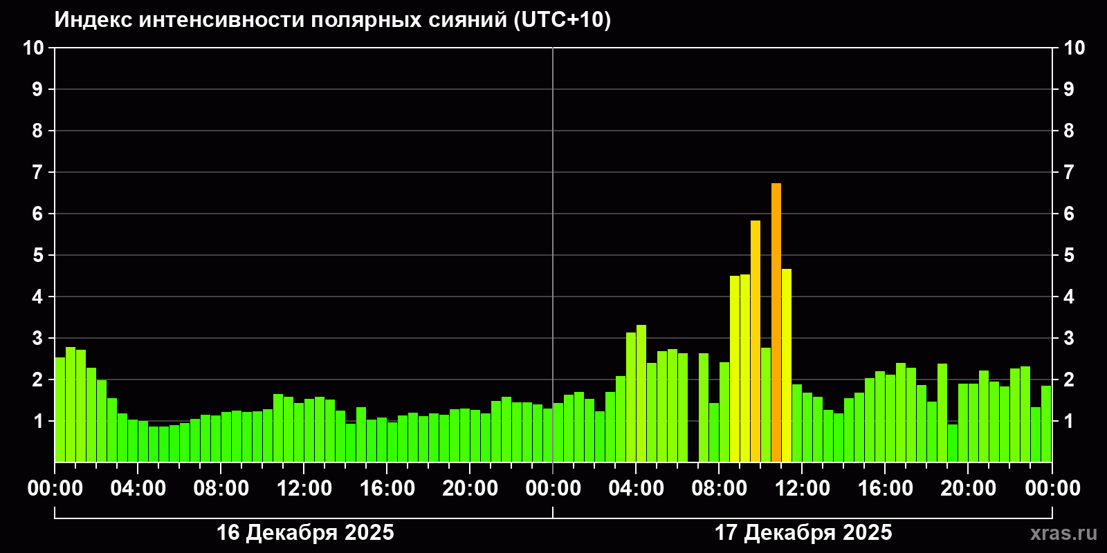 Изменения индекса интенсивности полярных сияний с 2025-12-16 по 2025-12-17 по местному времени