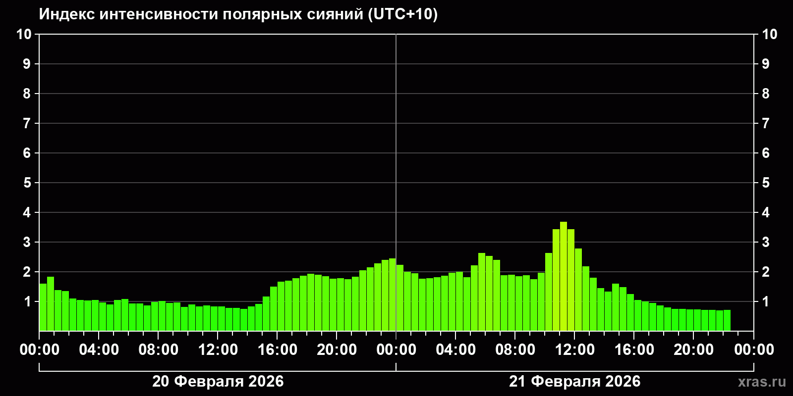 Изменения индекса интенсивности полярных сияний с 2026-02-20 по 2026-02-21 по местному времени
