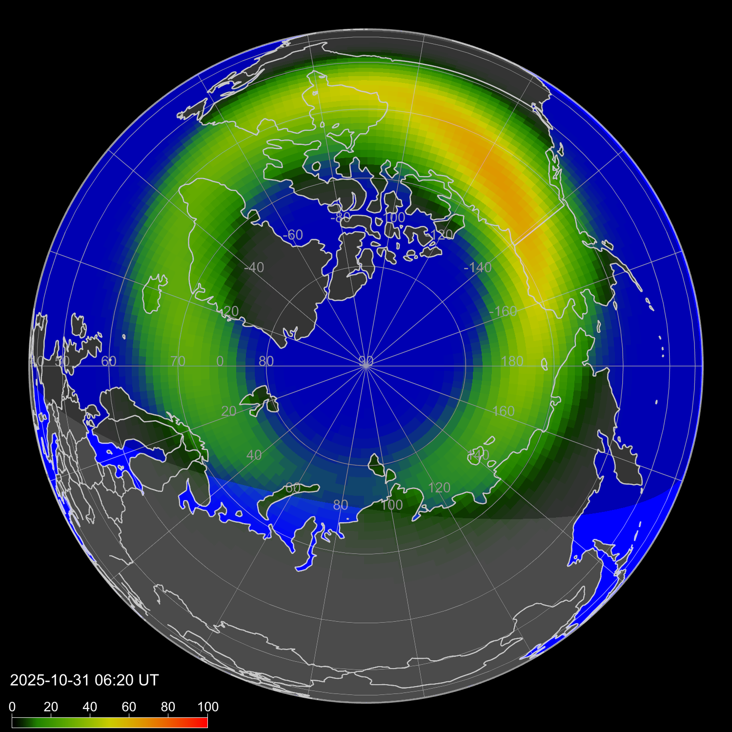 Изменения и часовой прогноз индекса интенсивности полярных сияний с 2025-10-30 по 2025-10-31