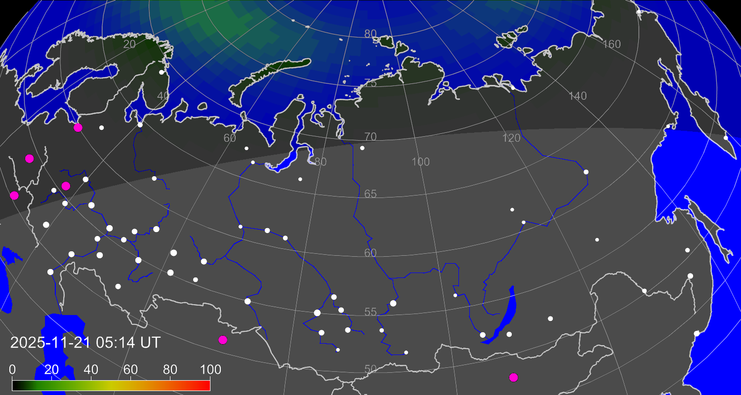 Индекс интенсивности полярных сияний и теоретически возможная широта наблюдений для ночного времени в восточном полушарии