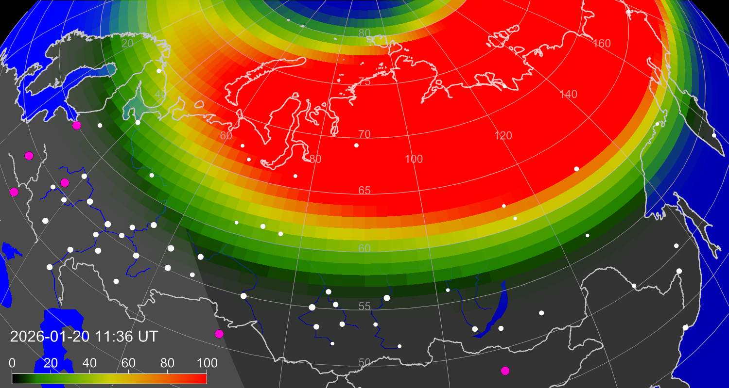 Изменения и часовой прогноз индекса интенсивности полярных сияний с 2026-01-20 по 2026-01-21