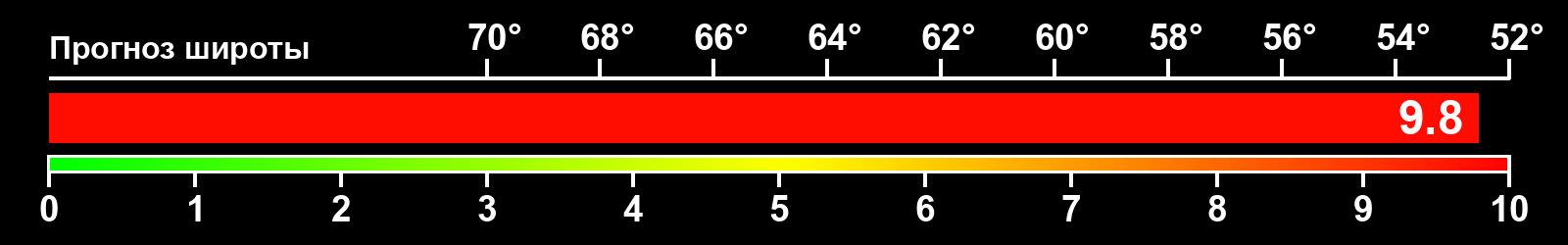 Индекс интенсивности полярных сияний и теоретически возможная широта наблюдений для ночного времени в восточном полушарии по состоянию на 2026-03-22 23:56 (конец дня) по местному времени