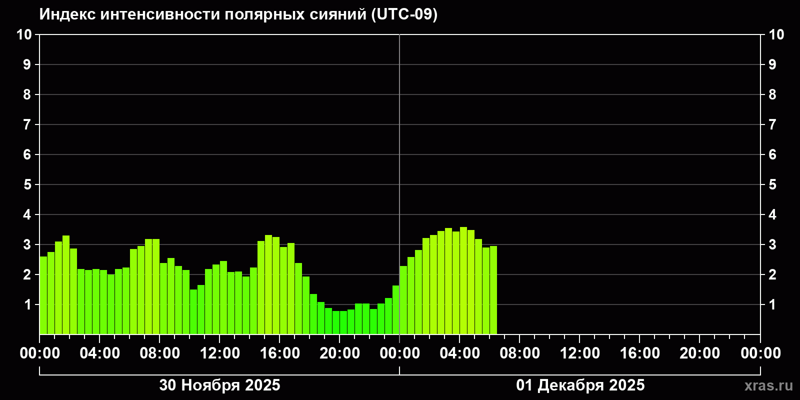 Изменения индекса интенсивности полярных сияний с 2025-11-30 по 2025-12-01 по местному времени