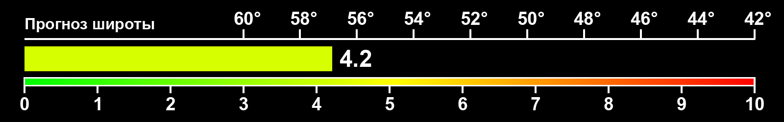 Индекс интенсивности полярных сияний и теоретически возможная широта наблюдений для ночного времени в западном полушарии по состоянию на 2026-03-20 23:50 (конец дня) по местному времени