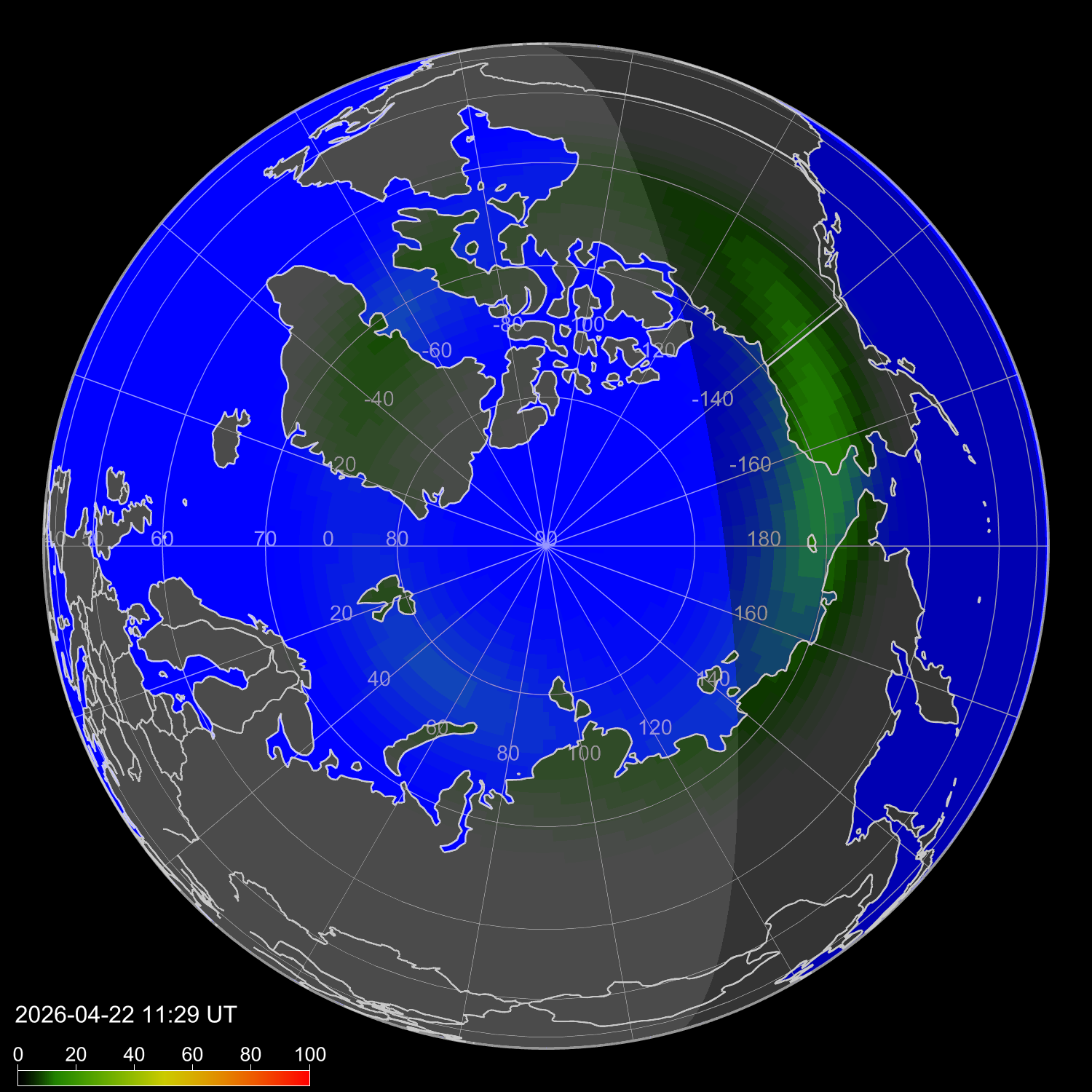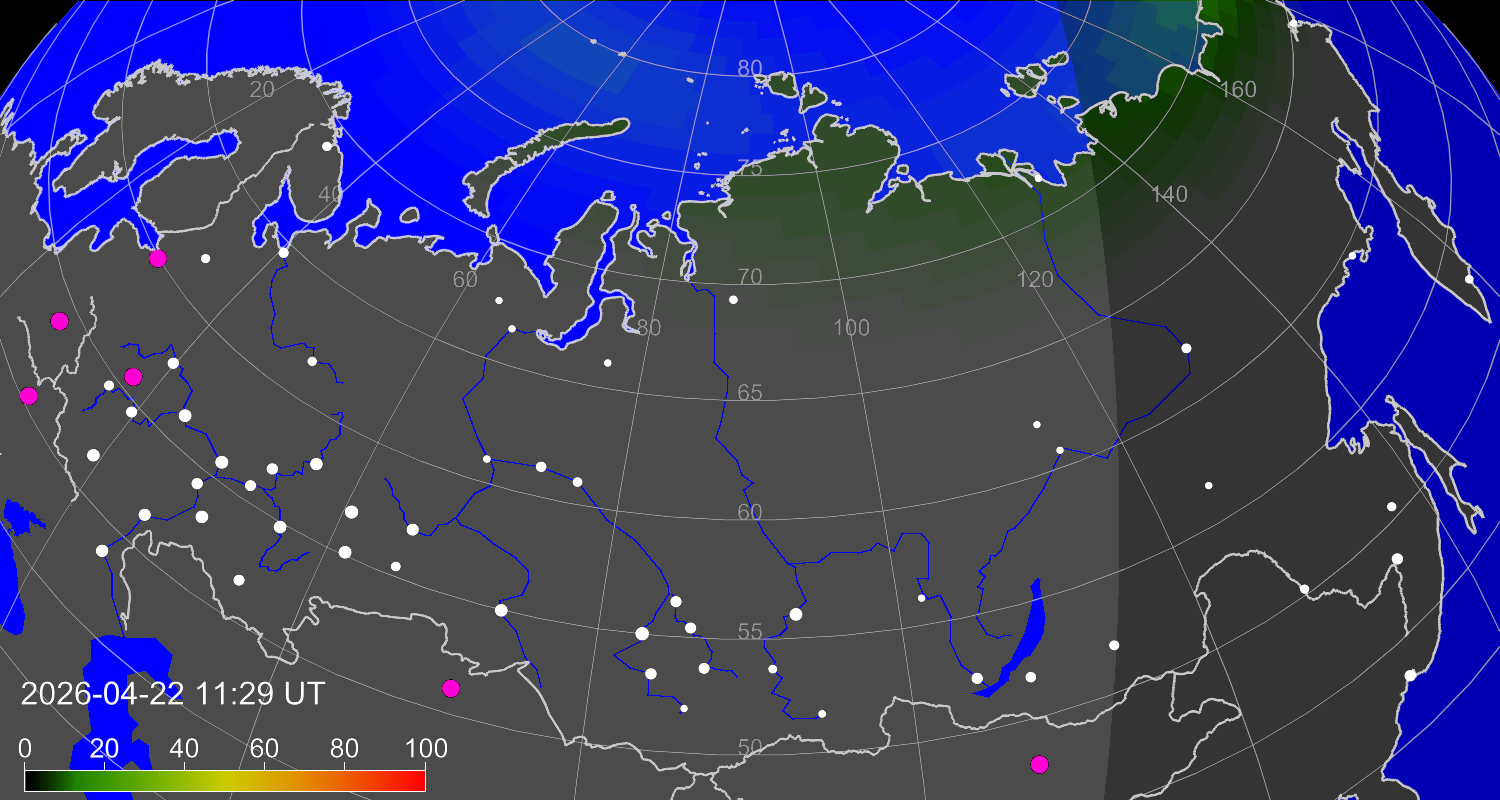 Индекс интенсивности полярных сияний и теоретически возможная широта наблюдений для ночного времени в восточном полушарии