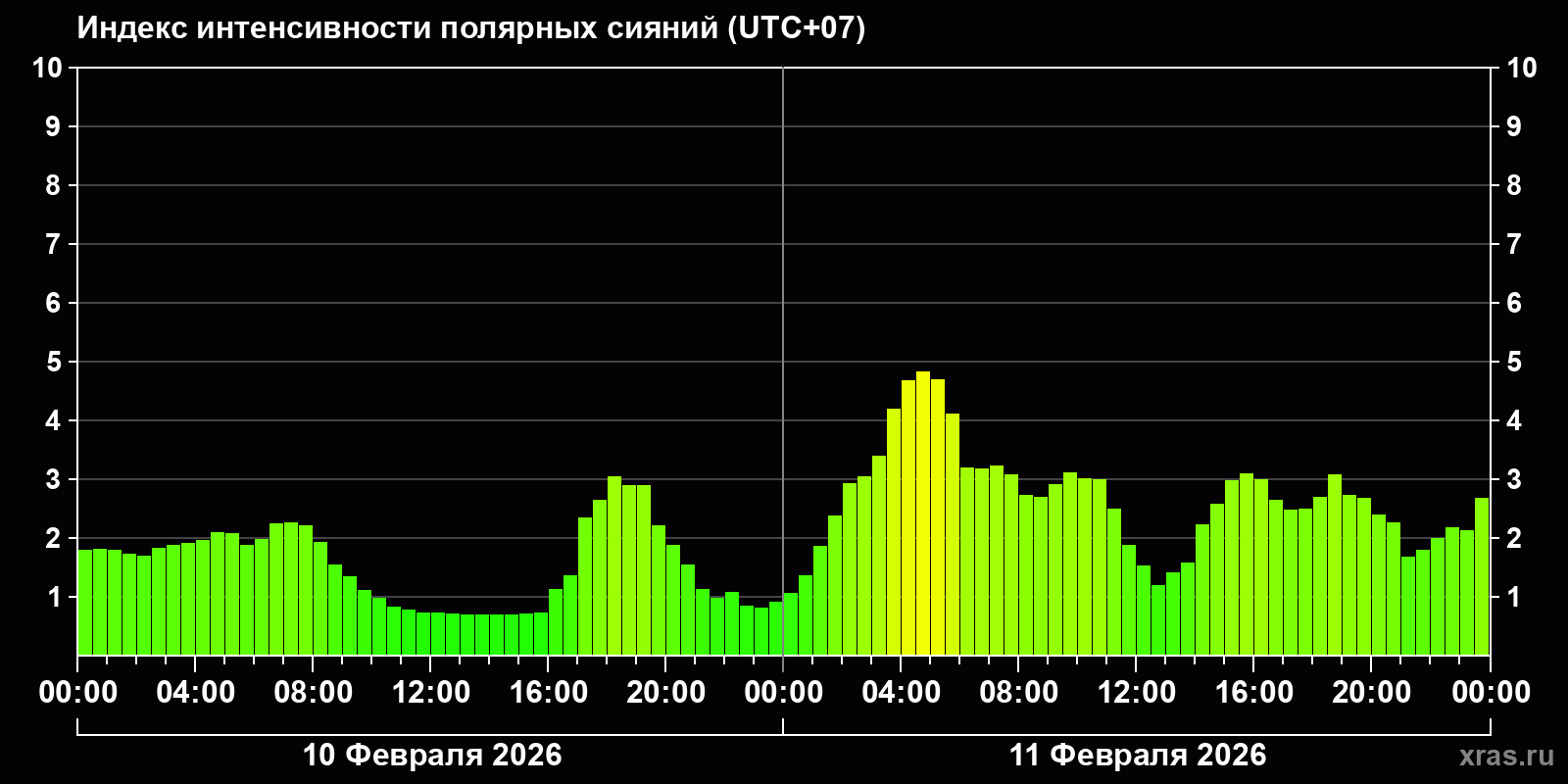 Изменения индекса интенсивности полярных сияний с 2026-02-10 по 2026-02-11 по местному времени