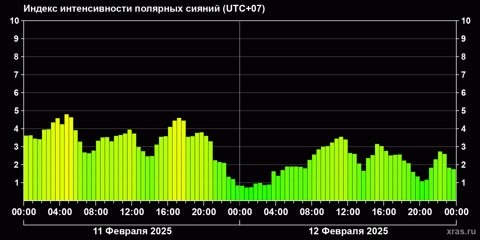 Изменения индекса интенсивности полярных сияний с 2025-02-11 по 2025-02-12 по местному времени