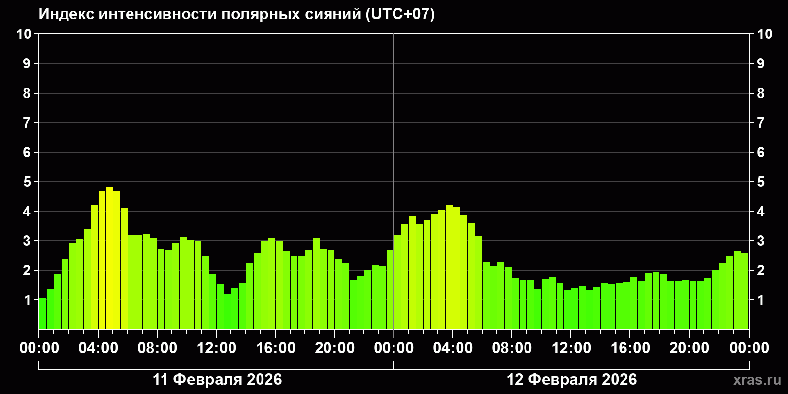 Изменения индекса интенсивности полярных сияний с 2026-02-11 по 2026-02-12 по местному времени