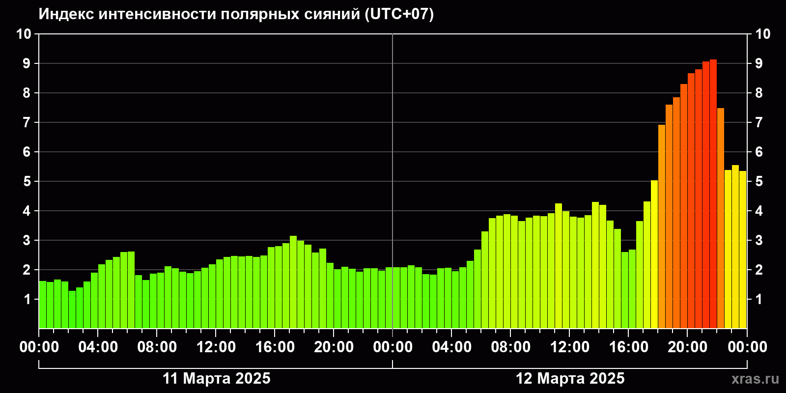 Изменения индекса интенсивности полярных сияний с 2025-03-11 по 2025-03-12 по местному времени