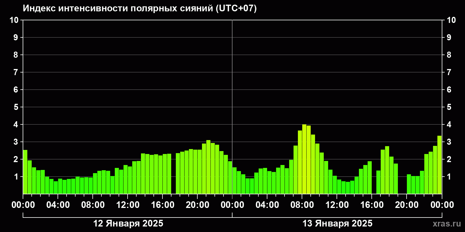 Изменения индекса интенсивности полярных сияний с 2025-01-12 по 2025-01-13 по местному времени