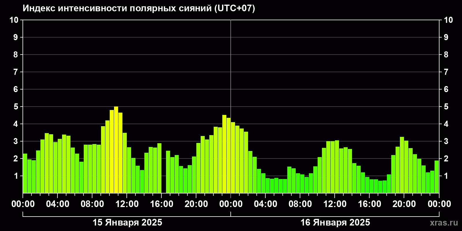 Изменения индекса интенсивности полярных сияний с 2025-01-15 по 2025-01-16 по местному времени