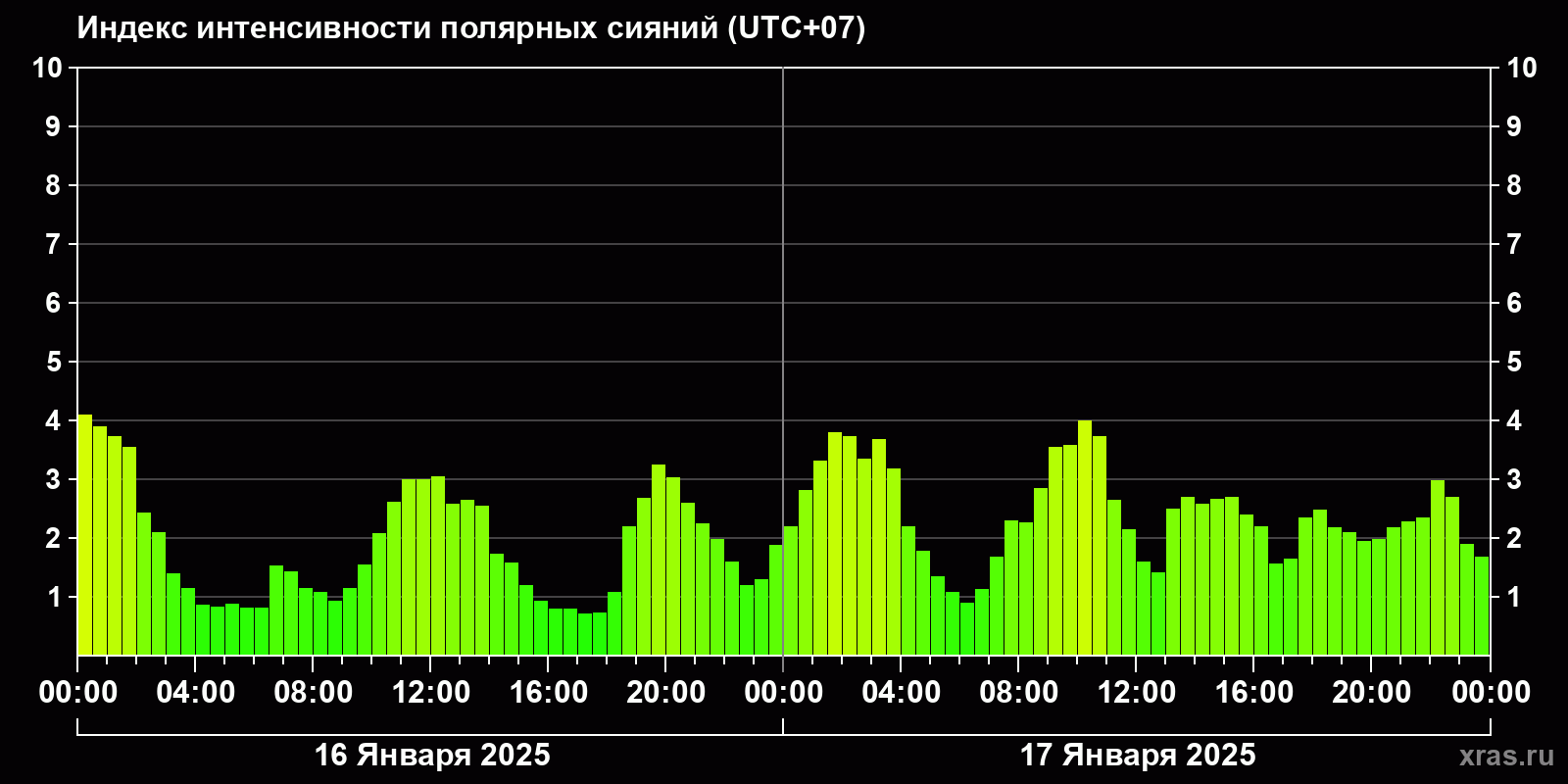 Изменения индекса интенсивности полярных сияний с 2025-01-16 по 2025-01-17 по местному времени