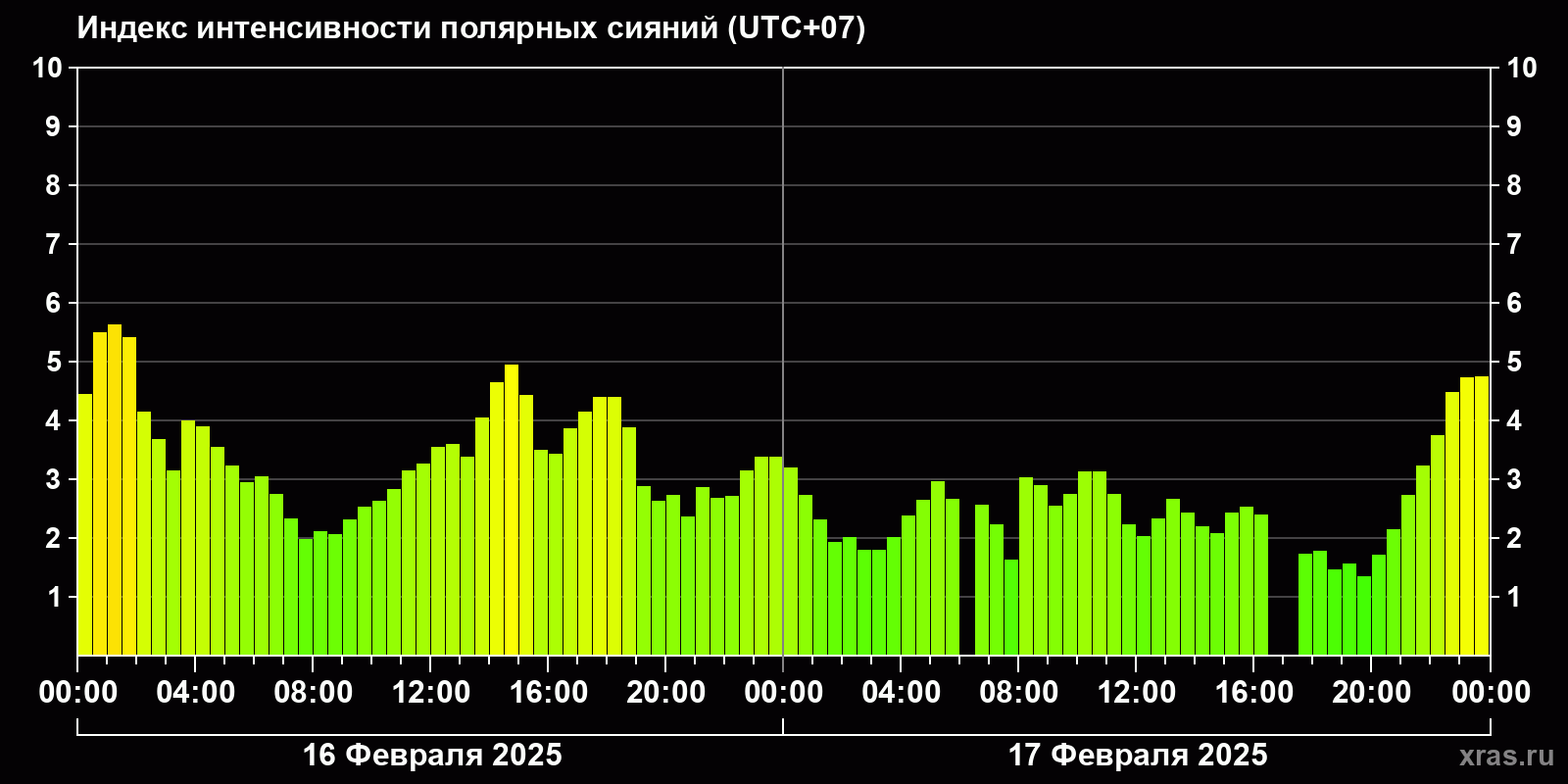 Изменения индекса интенсивности полярных сияний с 2025-02-16 по 2025-02-17 по местному времени