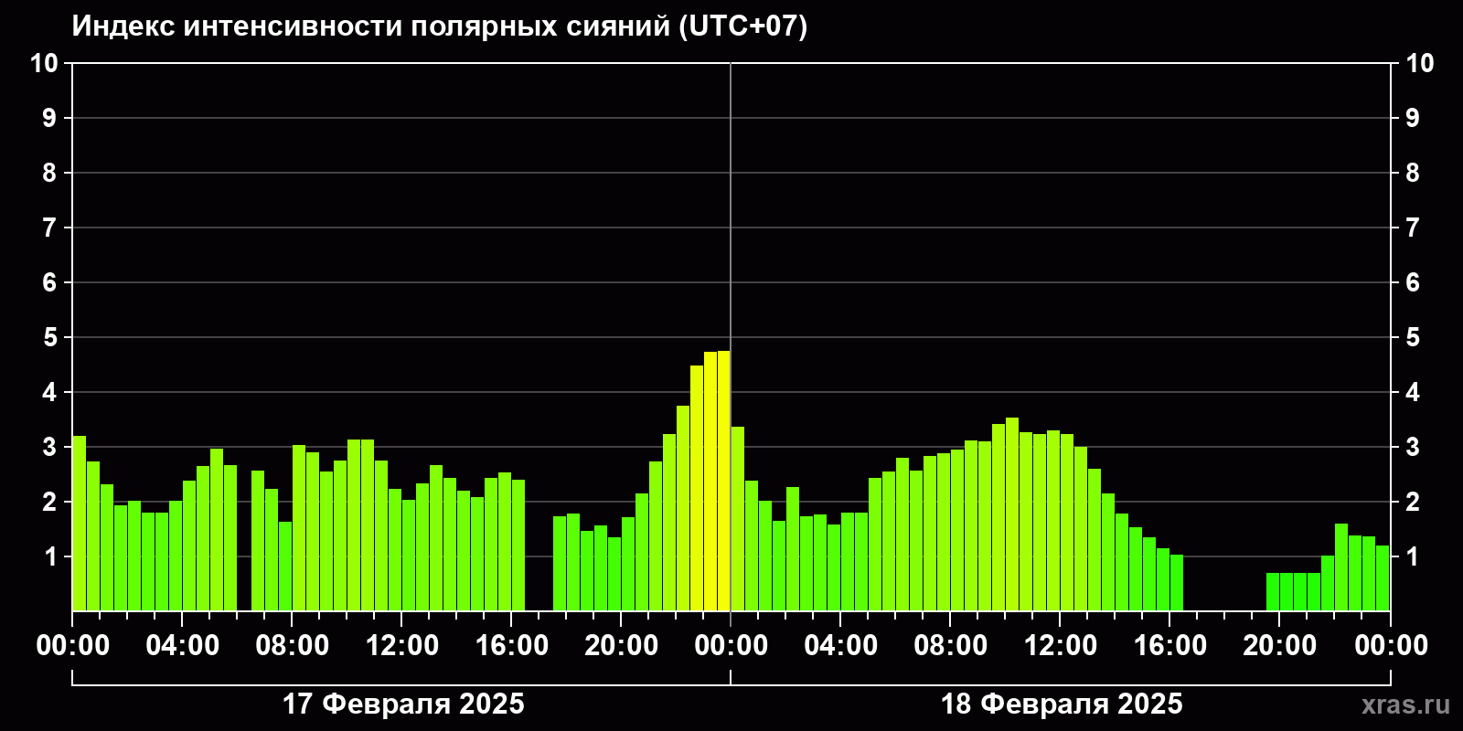 Изменения индекса интенсивности полярных сияний с 2025-02-17 по 2025-02-18 по местному времени
