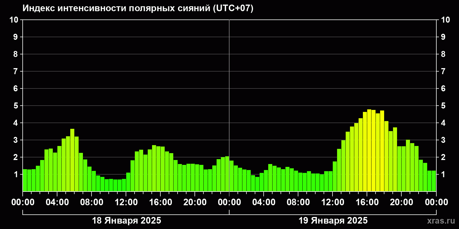 Изменения индекса интенсивности полярных сияний с 2025-01-18 по 2025-01-19 по местному времени