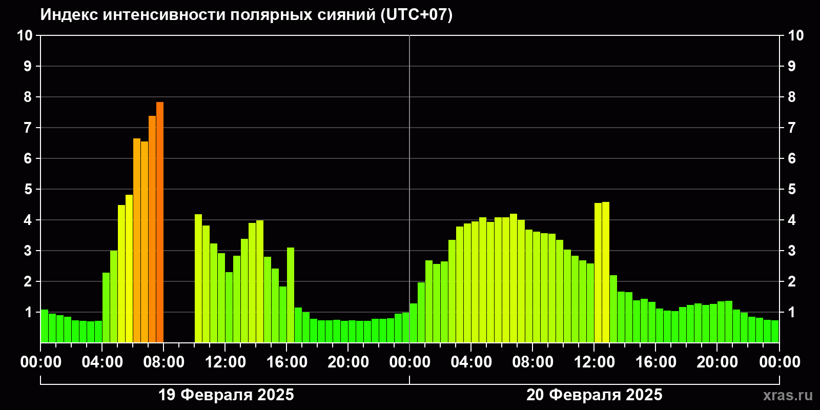 Изменения индекса интенсивности полярных сияний с 2025-02-19 по 2025-02-20 по местному времени