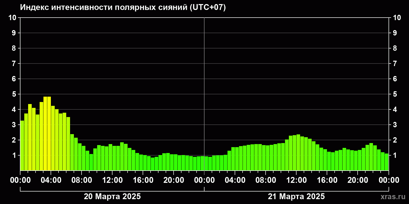 Изменения индекса интенсивности полярных сияний с 2025-03-20 по 2025-03-21 по местному времени