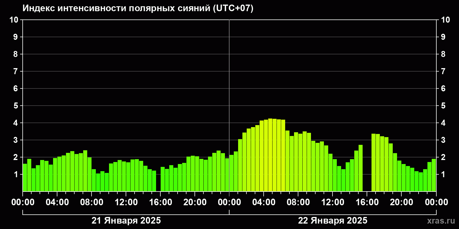 Изменения индекса интенсивности полярных сияний с 2025-01-21 по 2025-01-22 по местному времени