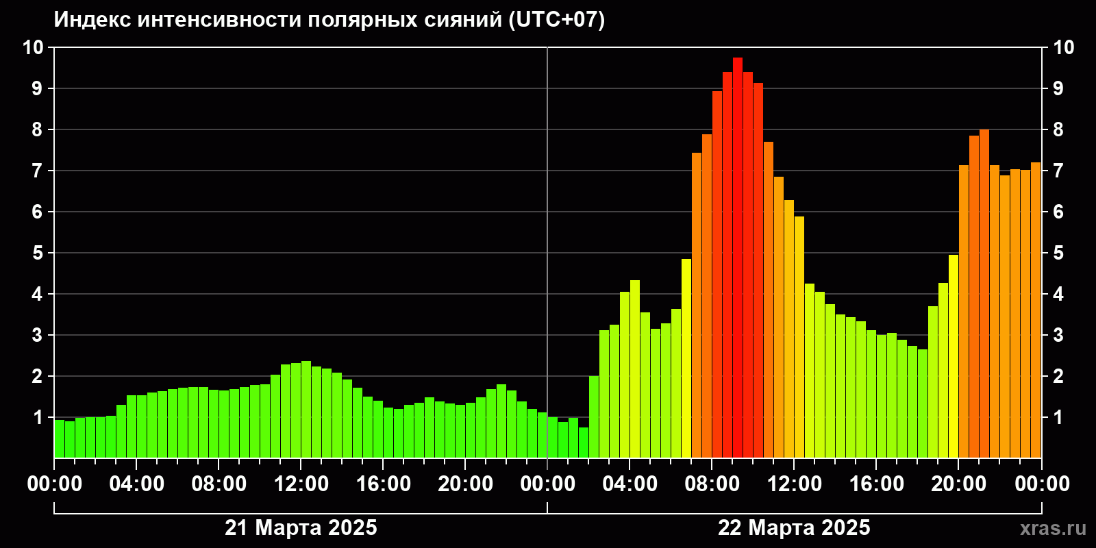 Изменения индекса интенсивности полярных сияний с 2025-03-21 по 2025-03-22 по местному времени