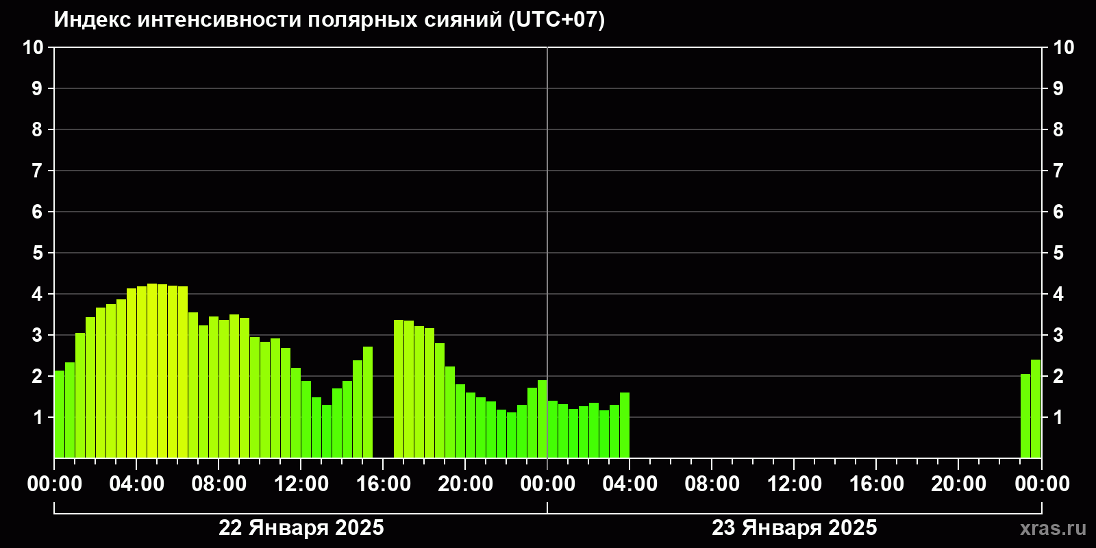 Изменения индекса интенсивности полярных сияний с 2025-01-22 по 2025-01-23 по местному времени