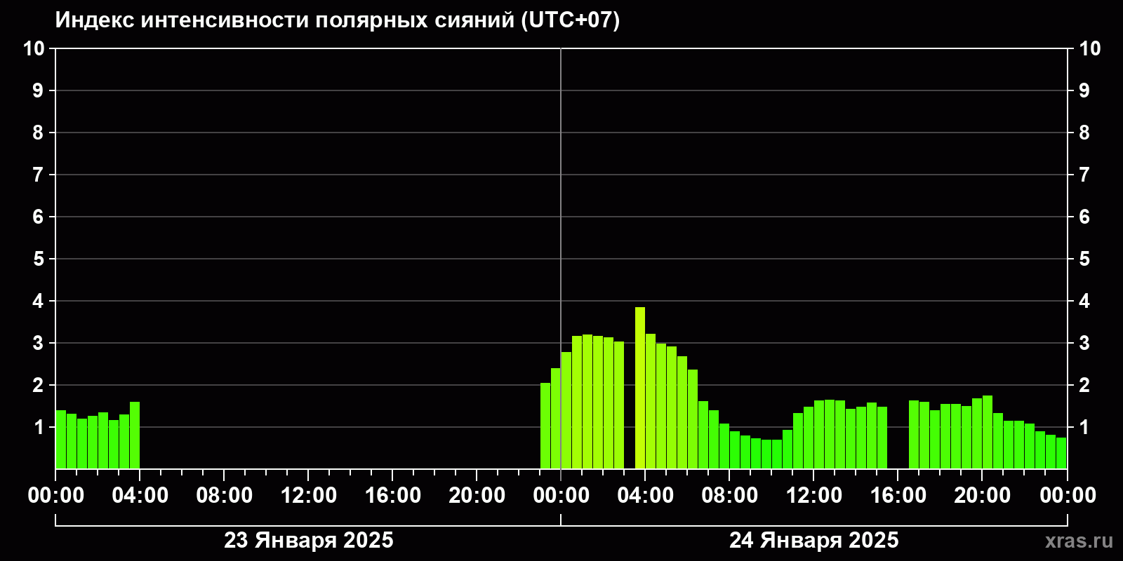 Изменения индекса интенсивности полярных сияний с 2025-01-23 по 2025-01-24 по местному времени