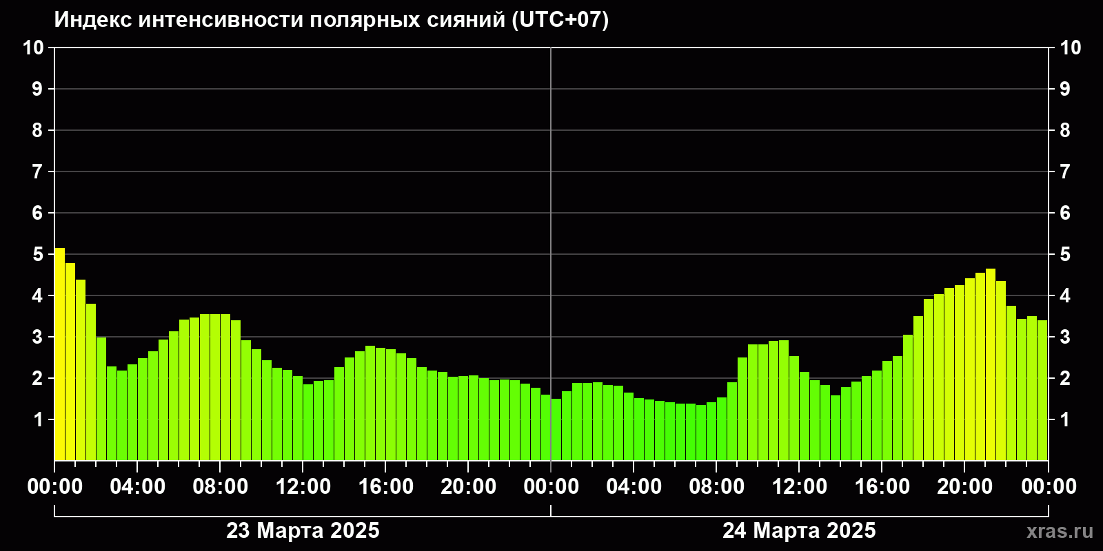 Изменения индекса интенсивности полярных сияний с 2025-03-23 по 2025-03-24 по местному времени